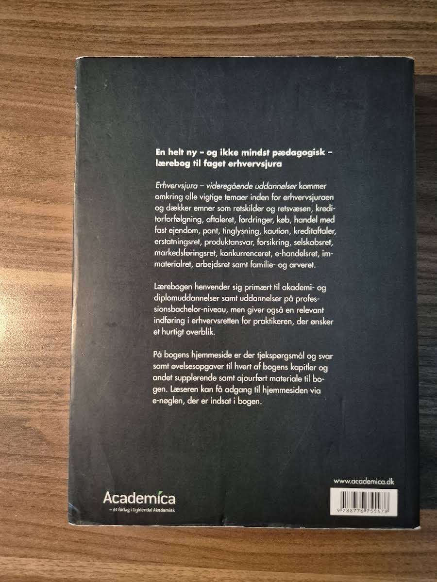 Erhvervsjura er en omhyggeligt udformet og didaktisk tilrettelagt lærebog, der giver et solidt overblik over centrale temaer inden for erhvervsretten. Bogen præsenterer en række vigtige emner såsom retskilder, kreditorforfølgning, aftaleret, fordringer, køb og handel med fast ejendom, samt pant, tinglysning, kaution og kreditaftaler. Med fokus på at gøre komplekse juridiske sammenhænge tilgængelige, behandler værket også erstatningsret, produktansvar, forsikring og selskabsret. Desuden inddrager bogen markedsføringsret, konkurrenceret, e-handelsret, immaterialret, arbejdsret samt familie- og arveret, hvilket sikrer en bred og nuanceret forståelse af faget. Lærebogen henvender sig primært til studerende på akademi- og diplomuddannelser samt uddannelser på professionsbachelor-niveau, og fungerer samtidig som en værdifuld introduktion for praktikere, der søger et hurtigt overblik over erhvervsrettens centrale problemstillinger.