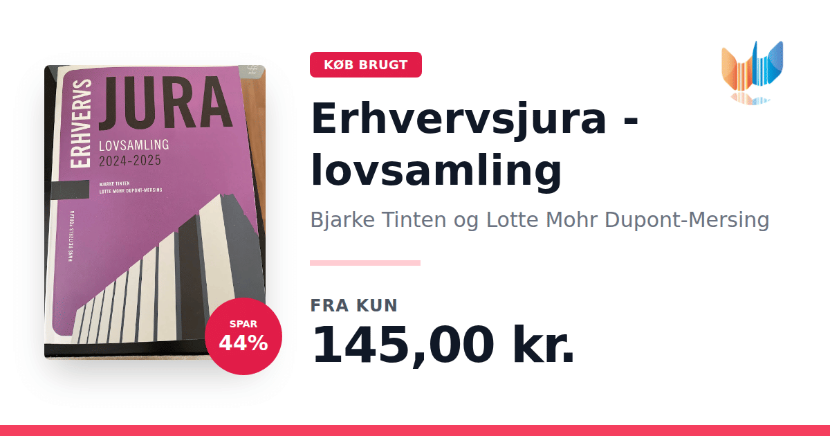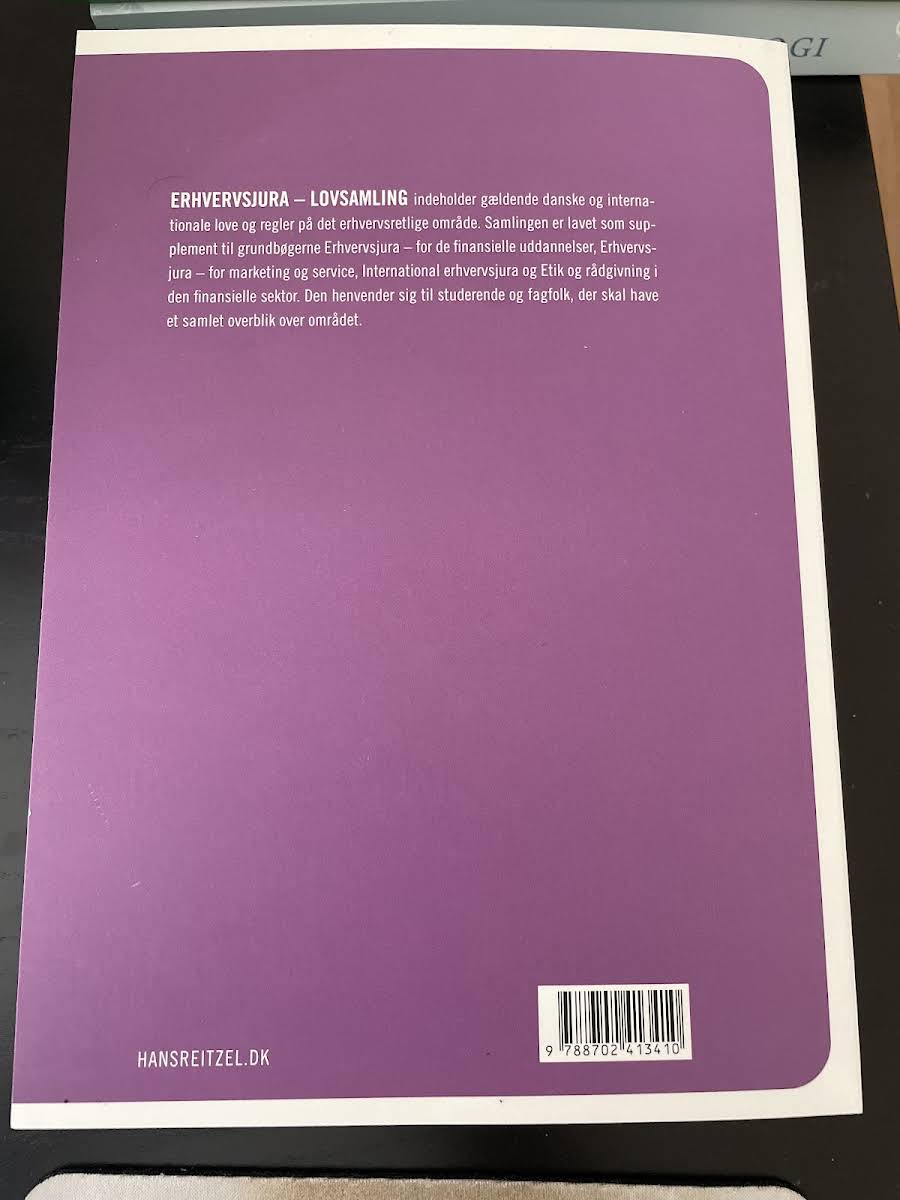 Erhvervsjura - lovsamling 2024-2025 (2. udgave) af Bjarke Tinten og Lotte Mohr Dupont-Mersing samler alle gældende erhvervsretlige love, bekendtgørelser og forordninger. Denne opdaterede udgave er nøje struktureret, så stoffet præsenteres overskueligt. Lovsamlingen fungerer som et uundværligt supplement til lærebøger om erhvervsjura. Den dækker det erhvervsretlige område bredt og giver et samlet overblik over det nødvendige pensum. Den retter sig mod finansøkonomer, markedsføringsøkonomer og andre KVU-uddannelser samt studerende på akademiuddannelsen i finansiel rådgivning. Samtidig er den velegnet til indledende erhvervsretlige kurser på HA, HD og beslægtede uddannelser.