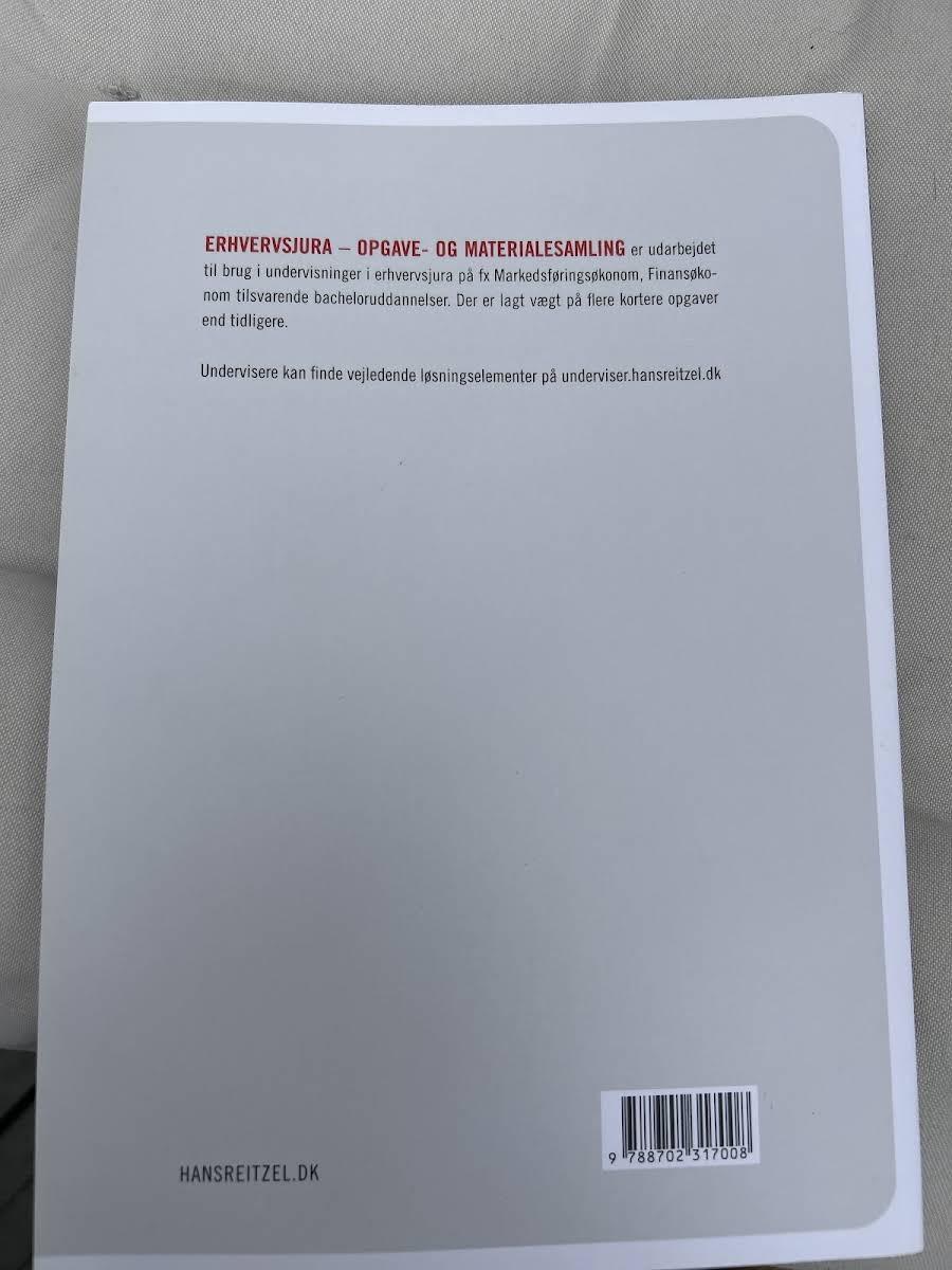 Denne opgave- og materialesamling knytter sig til de centrale lærebøger inden for erhvervsjura og dækker de samme emneområder. Den byder på en grundig vejledning i opgaveløsning, der sætter kursen for en intensiv gennemgang af faget. Samlingen omfatter centrale discipliner såsom juridisk metode og retskilder, domstolene og procesretlige grundsætninger, aftaleret, køberet, erstatningsret og produktansvar. Yderligere indgår selskabsret, arbejdsret, persondata og fintech som vigtige elementer. Der behandles også lejeret, udbudsret, transportret, markedsføringsret, e-handelsret, varemærkeret samt international privatret på en struktureret måde. Endvidere indgår insolvensret, gældsbreve og andre fordringer, handel med fast ejendom, tinglysning, pant, kaution og kreditaftaler. Afslutningsvis fokuserer samlingen på familieret og arveret og indeholder opgaver af varierende omfang suppleret med relevante materialer, der tilsammen giver et solidt fundament for forståelsen af erhvervsjuridiske problemstillinger.
