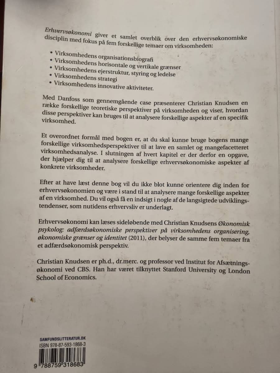 Med lærebogen Erhvervsøkonomi introducerer Christian Knudsen læseren til centrale teorier og metoder inden for erhvervsøkonomisk analyse. Bogen fokuserer på samspillet mellem teori og praksis og viser, hvordan man ved hjælp af en konkret case kan belyse og analysere forskellige aspekter af en virksomhed. Hvert kapitel afsluttes med en række opgaver, der giver de studerende mulighed for selvstændigt at arbejde med cases og omsætte teori til praksis. Anden udgave fra 2014 byder på 415 sider med indholdsrige eksempler og en anvendelig tilgang, som gør faget tilgængeligt og relevant for enhver studerende.