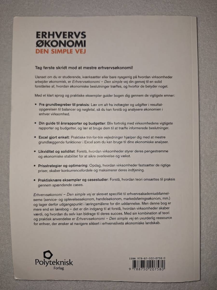 Erhvervsøkonomi - Den simple vej Uanset om du studerer, er iværksætter eller blot ønsker en dybere indsigt i virksomheders økonomiske arbejde, er denne bog din genvej til at mestre faget. Erhvervsøkonomi - Den simple vej er skrevet med fokus på at skabe en solid forståelse for, hvordan økonomiske beslutninger træffes, og hvilken betydning de har for en virksomheds drift. Bogen guider læseren gennem de væsentligste emner med et klart og tilgængeligt sprog. Du bliver introduceret til grundlæggende begreber som indtægter, udgifter, resultatopgørelse og balance, hvilket ruster dig til at analysere og forstå økonomien i enhver type virksomhed ved hjælp af relevante nøgletal. For at bygge bro mellem teori og praksis indeholder bogen konkrete vejledninger til Excel. Gennem praktiske trin-for-trin guides lærer du at anvende regnearkets funktioner til dine egne økonomiske analyser. Samtidig får du en grundig indføring i arbejdet med årsrapporter og budgetter, så du kan bruge disse værktøjer aktivt i beslutningsprocesser. Der dykkes desuden ned i emner som likviditet og soliditet, hvor du lærer, hvordan man styrer pengestrømme for at skabe den økonomiske stabilitet, der er nødvendig for overlevelse og vækst. Også prisstrategier og optimering gennemgås, så du forstår, hvordan man fastsætter priser, der både øger indtjeningen og skaber konkurrencefordele. Bogen anvender casestudier og praktiske eksempler til at vise, hvordan teorien ser ud i virkeligheden. Det gør Erhvervsøkonomi - Den simple vej til et uundværligt redskab for alle, der vil forstå de økonomiske forudsætninger for at skabe værdi og succes i erhvervslivet.