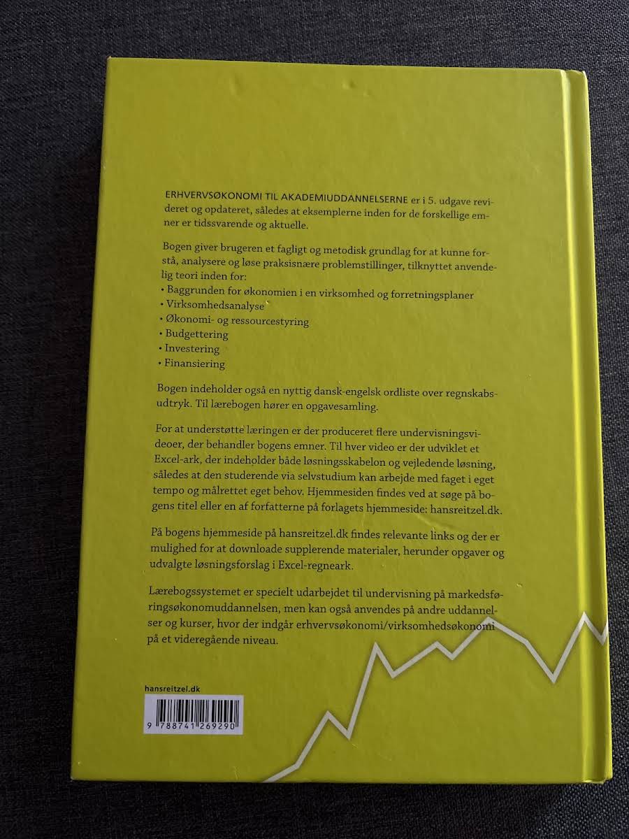 Denne 5. udgave af Erhvervsøkonomi til Akademiuddannelserne er specielt udviklet til undervisningen på markedsføringsøkonomuddannelsen og andre akademiske kurser, hvor virksomhedsøkonomi spiller en central rolle. Bogen er opdateret i overensstemmelse med den nye studieordning, og den indeholder aktuelle eksempler, som gør det muligt at forstå og anvende centrale metoder inden for virksomhedsanalyse, økonomi- og ressourcestyring, budgettering, investering og finansiering. Med et solidt fagligt og metodisk fundament hjælper bogen de studerende med at gribe praksisnære problemstillinger an. Der indgår desuden en praktisk dansk-engelsk ordliste over regnskabsudtryk, som gør det lettere at navigere i fagsproget. Samtidig understøttes læsningen af en tilhørende opgavesamling med en brugervenlig angivelse af sværhedsgraden, der giver mulighed for en målrettet repetition af stoffet.