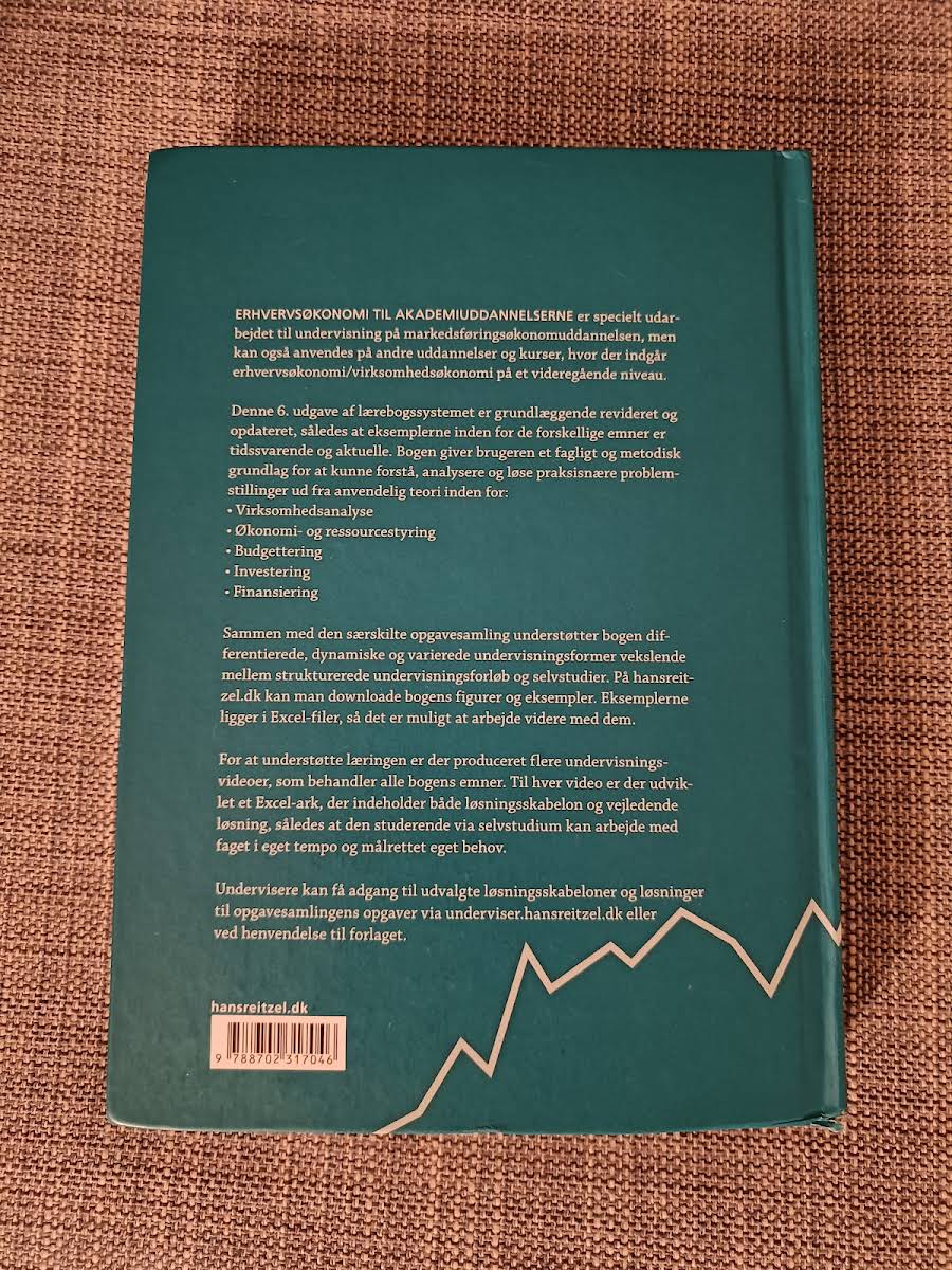 Erhvervsøkonomi til Akademiuddannelserne er udarbejdet med henblik på at give studerende et solidt fagligt og metodisk grundlag, så de kan forstå, analysere og løse praksisnære problemstillinger med udgangspunkt i relevant teori. Den 6. udgave er grundigt revideret og opdateret med tidssvarende eksempler, der afspejler nutidens erhvervsliv og økonomiske forhold. Bogen behandler centrale emner inden for virksomhedsanalyse, økonomi- og ressourcestyring, budgettering, investering og finansiering. Den er tilrettelagt, så den både understøtter strukturerede undervisningsforløb og selvstændigt studium, og den indeholder opgavesamlinger og digitale materialer, der fremmer læringen gennem praktisk anvendelse og øvelser.