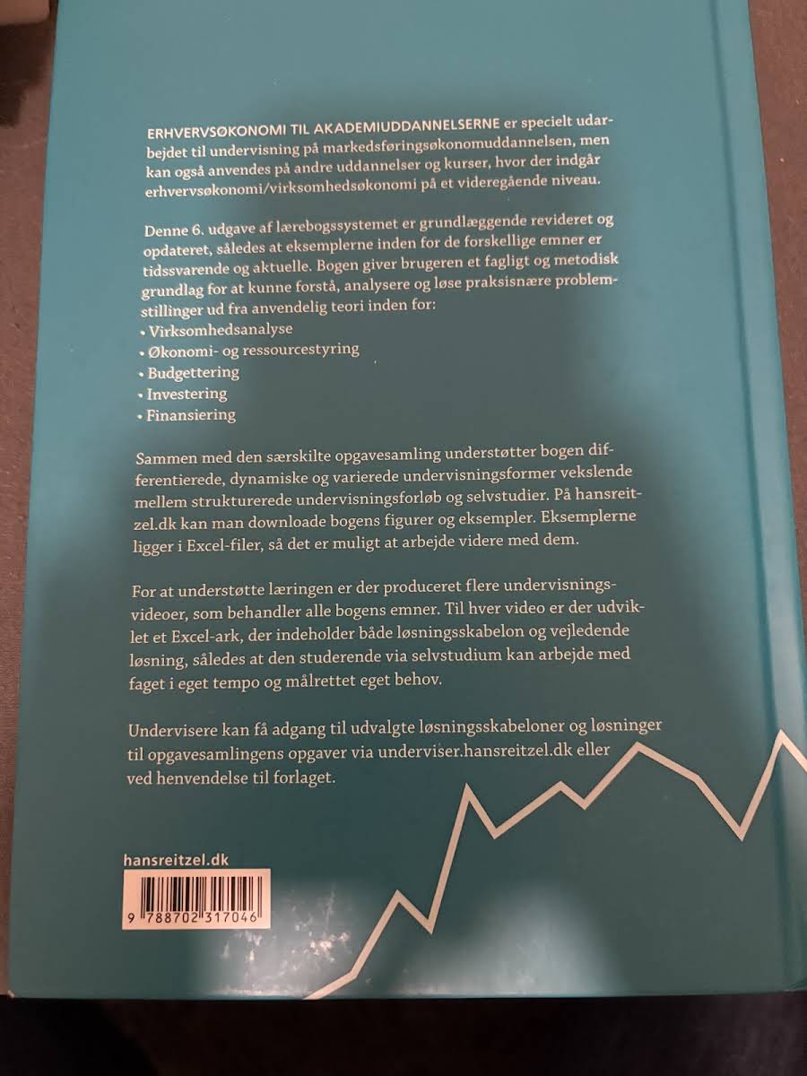 Erhvervsøkonomi til Akademiuddannelserne er udarbejdet med henblik på at give studerende et solidt fagligt og metodisk grundlag, så de kan forstå, analysere og løse praksisnære problemstillinger med udgangspunkt i relevant teori. Den 6. udgave er grundigt revideret og opdateret med tidssvarende eksempler, der afspejler nutidens erhvervsliv og økonomiske forhold. Bogen behandler centrale emner inden for virksomhedsanalyse, økonomi- og ressourcestyring, budgettering, investering og finansiering. Den er tilrettelagt, så den både understøtter strukturerede undervisningsforløb og selvstændigt studium, og den indeholder opgavesamlinger og digitale materialer, der fremmer læringen gennem praktisk anvendelse og øvelser.