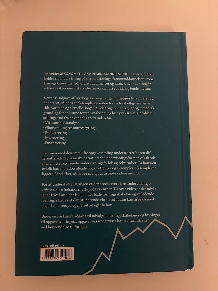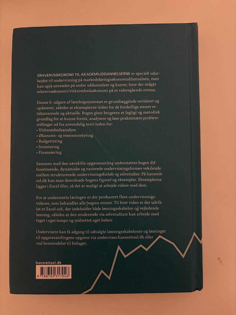 Erhvervsøkonomi til Akademiuddannelserne er udarbejdet med henblik på at give studerende et solidt fagligt og metodisk grundlag, så de kan forstå, analysere og løse praksisnære problemstillinger med udgangspunkt i relevant teori. Den 6. udgave er grundigt revideret og opdateret med tidssvarende eksempler, der afspejler nutidens erhvervsliv og økonomiske forhold. Bogen behandler centrale emner inden for virksomhedsanalyse, økonomi- og ressourcestyring, budgettering, investering og finansiering. Den er tilrettelagt, så den både understøtter strukturerede undervisningsforløb og selvstændigt studium, og den indeholder opgavesamlinger og digitale materialer, der fremmer læringen gennem praktisk anvendelse og øvelser.