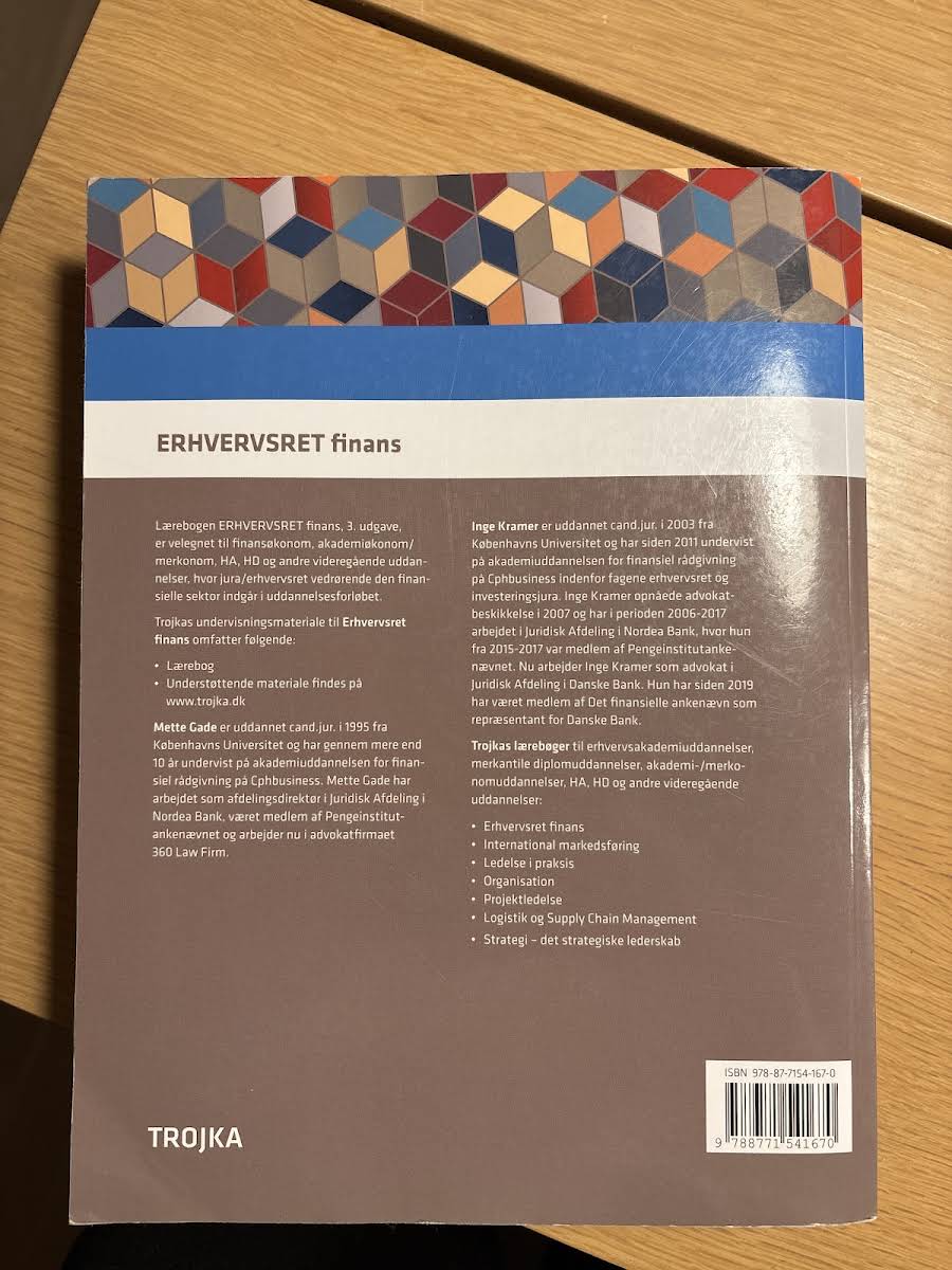 Erhvervsrettens komplekse regelsæt kan virke uoverskueligt, især når man møder juridiske problemstillinger for første gang i en finansiel kontekst. ERHVERVSRET - Finans er derfor udviklet med fokus på at skabe en letforståelig indføring i juraen, uden at gå på kompromis med det faglige niveau, som kræves på videregående uddannelser. Bogen gennemgår grundlæggende principper og regler med inddragelse af mange nye domme og afgørelser. For at lette læsningen er stoffet illustreret med margennoter, grafiske figurer og overskuelige skemaer. Hvert kapitel afsluttes med en tjekliste over de vigtigste hovedregler og praktiske eksempler, der styrker den studerendes evne til at anvende teorien i konkrete situationer. Som supplement til lærebogen stilles der e-læringsmateriale til rådighed på bogens website. Her kan du downloade alle figurer, finde nyttige links, standardformularer samt tjekspørgsmål og opgaver til hvert kapitel. Undervisere får adgang til tilpasselige PowerPoint-præsentationer, som kan anvendes direkte i undervisningen. ERHVERVSRET - Finans, 3. udgave (Trojka 2022), er målrettet undervisning i erhvervsret/erhvervsjura på erhvervsakademiuddannelser og andre videregående uddannelser som finansøkonom, akademiøkonom, merkonom, HA og HD, hvor erhvervsret indgår som en central del af studieforløbet.