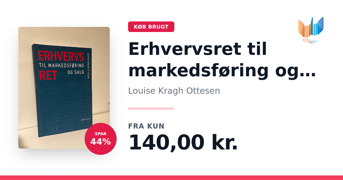 Lige nu kan du købe "Erhvervsret til markedsføring og salg" af Louise Kragh Ottesen til kun 140,00 kr. Du sparer hele 44% af nyprisen! Bogen du ser her er brugt, og i perfekt stand. Vi har i øjeblikket kun et enkelt eksemplar til salg af "Erhvervsret til markedsføring og salg", så slå til mens du kan!