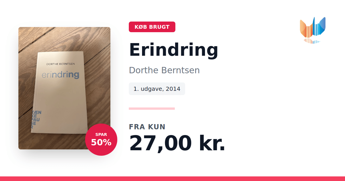 Lige nu kan du købe "Erindring" af Dorthe Berntsen til kun 27,00 kr. Du sparer hele 50% af nyprisen! Bogen du ser her er brugt, og i perfekt stand. Vi har i øjeblikket 2 eksemplarer til salg af "Erindring", så husk at se de forskellige udgaver.