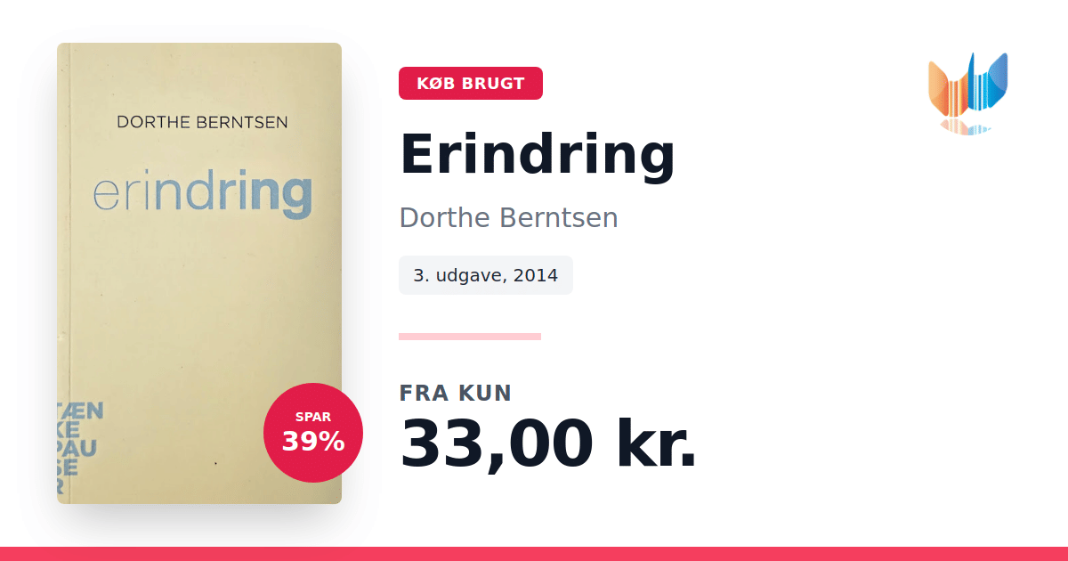 Lige nu kan du købe "Erindring" af Dorthe Berntsen til kun 33,00 kr. Du sparer hele 39% af nyprisen! Bogen du ser her er brugt, og i god stand. Vi har i øjeblikket 2 eksemplarer til salg af "Erindring", så husk at se de forskellige udgaver.