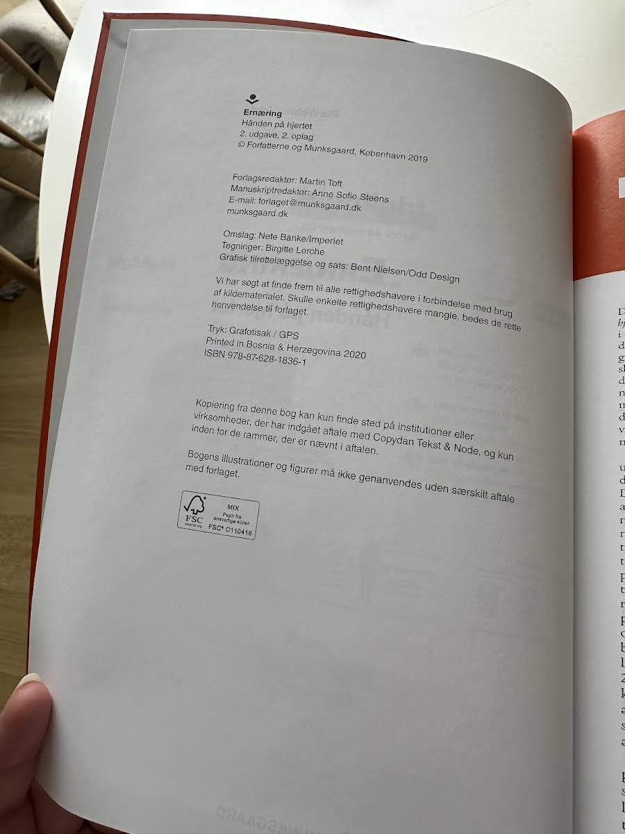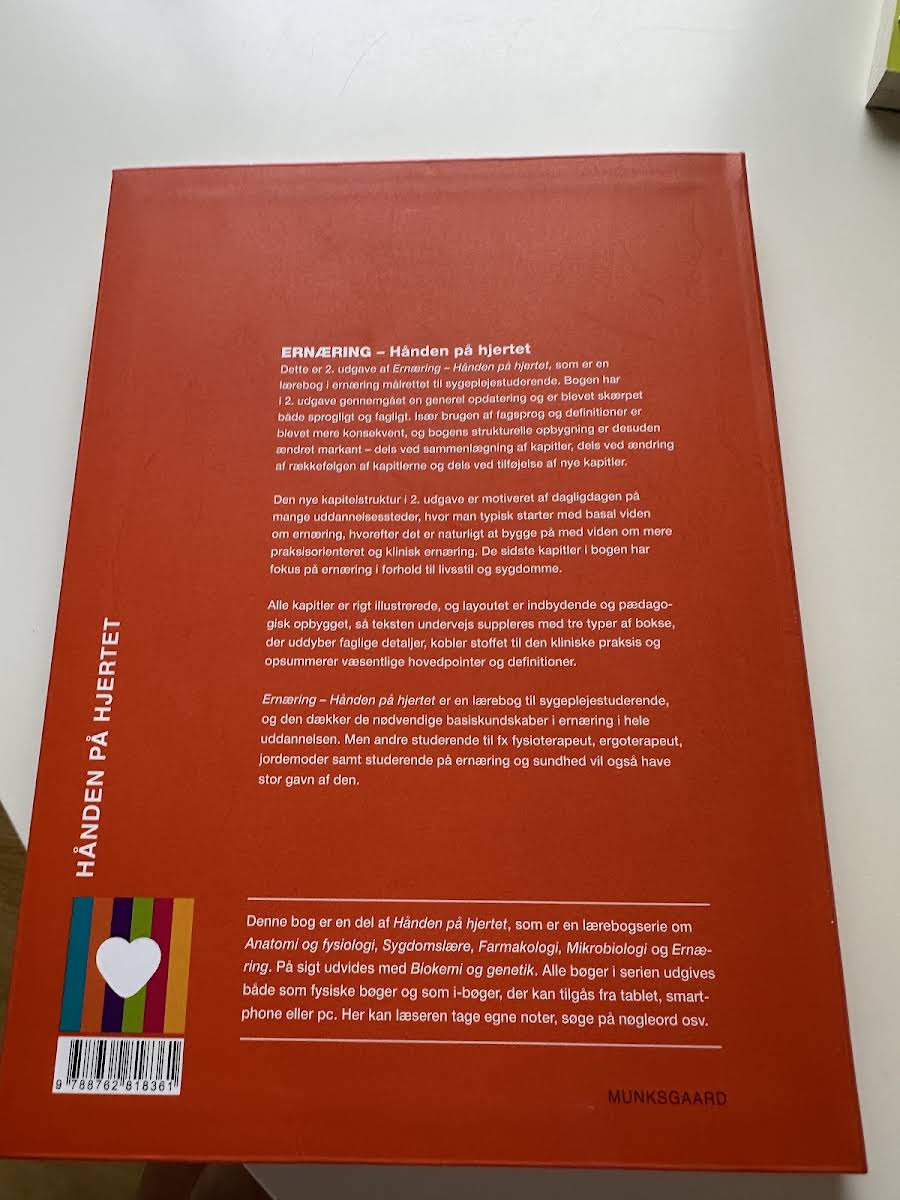 Ernæring – Hånden på hjertet, 2. udgave, udgivet i 2019 og udarbejdet af et anerkendt team af eksperter, er en opdateret og skærpet lærebog, der giver sygeplejestuderende et solidt fundament i ernæringsvidenskab. Med et konsekvent fagsprog og nye, relevante kapitler afspejler bogen den nyeste udvikling inden for ernæring, så den både er pædagogisk og klinisk relevant. I denne udgave er kapitlerne omstruktureret for at skabe en logisk progression, hvor læseren først introduceres til basal ernæringsviden og derefter ledes videre mod praksisnære og kliniske aspekter. Illustrative elementer og tekstbokse med nøgledefinitioner og opklarende information supplerer stoffet, hvilket gør bogen brugervenlig og lærerig for studerende inden for både sygepleje, fysioterapi, ergoterapi, ernæring og sundhed samt jordemoderstuderende. Med sin opdaterede formidling og veltilrettelagte indhold er Ernæring – Hånden på hjertet et uundværligt redskab for alle, der ønsker at opnå en dybdegående forståelse af ernæringens grundprincipper og praktiske anvendelser i sundhedssektoren.