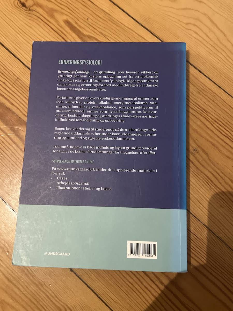 Ernæringsfysiologi – en grundbog til ernæringsvidenskaben præsenterer en solid og systematisk gennemgang af kostens sammensætning set ud fra en biokemisk og fysiologisk vinkel. Bogen baserer sig på danske kostvaner og ernæringsforhold, herunder opdaterede resultater fra nationale kostundersøgelser. Den digitale udgave indeholder desuden et udvalg af multiple choice-opgaver og PowerPoint-filer med illustrative elementer, der understøtter undervisningen. Med en klar og overskuelig fremstilling af centrale emner såsom fedt, kulhydrat, protein, alkohol, energimetabolisme, vitaminer, mineraler og væskebalance, sætter forfatterne fokus på de praksisnære aspekter, herunder livsstilssygdomme, kostvurdering, kostplanlægning og næringsstofændringer ved forarbejdning og opbevaring. Bogen er specielt rettet mod studerende inden for ernæring, sundhed og sygepleje og præsenteres i en revideret og opdateret 3. udgave, der sikrer de bedste forudsætninger for en grundig faglig tilegnelse af stoffet.
