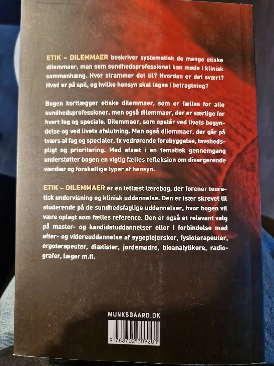 "Etik - dilemmaer" giver et indgående overblik over de etiske problemstillinger, der opstår i kliniske miljøer, og som påvirker sundhedsprofessionelle i hverdagen. Bogen indrammer de mange facetter af etiske udfordringer – fra monitørelsen af livets begyndelse og afslutning til de mere komplekse tværfaglige dilemmaer som forebyggelse, tavshedspligt og prioritering. Forfatter Jacob Birkler præsenterer en tematisk tilgang, hvor divergerende værdier og hensyn bliver belyst, og hvor både generelle og fagspecifikke aspekter vægtes. Med sin letlæste fremstilling kombinerer bogen teoretiske perspektiver med kliniske eksempler, hvilket gør den til et værdifuldt redskab for studerende inden for de sundhedsfaglige uddannelser. Samtidig er den et relevant supplement i master- og kandidatuddannelser samt ved efter- og videreuddannelse af sundhedsprofessionelle. Publikationsåret 2021, den praktiske paperbackudgave og dens 200 sider sikrer, at bogen tilbyder en omfattende og opdateret indsigt i etiske dilemmaer i sundhedssektoren.