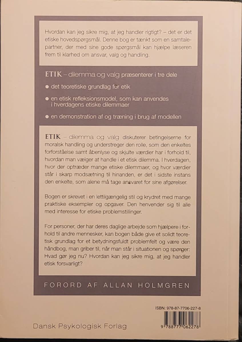 I "Etik – dilemma og valg" redegør Einar Aadland for, hvordan man står over for etiske udfordringer og træffer valg i hverdagen. Bogen byder på et solidt teoretisk grundlag, der sætter spørgsmålstegn ved, hvad det vil sige at handle rigtigt, og introducerer en etisk refleksionsmodel, som kan bruges til at navigere i komplekse dilemmaer. Gennem en lettilgængelig stil og med talrige praktiske eksempler og øvelser giver Aadland læseren værktøjer til at identificere og håndtere de moralske betingelser, der påvirker vores beslutninger. Bogen henvender sig bredt til alle, der interesserer sig for etik, og den tilbyder en klar vejledning i, hvordan man kan tage ansvar for sine handlinger, selv når værdier kolliderer.