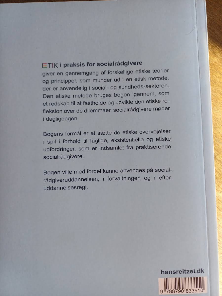 "Etik i praksis for socialrådgivere" byder på en grundig gennemgang af etiske teorier og principper, der sammen danner grundlag for en konkret etisk metode. Bogen omfatter en række redskaber, som kan anvendes til at fastholde og videreudvikle den etiske refleksion, der opstår i relation til de dilemmaer, socialrådgivere møder i deres dagligdag. Med en tæt forankring i praksisoplevelser fra autentiske socialrådgivere henvender bogen sig både til studerende under uddannelsen og til professionelt virkende socialrådgivere i efter- og videreuddannelse. Den etiske metode, som præsenteres, lægger vægt på at forbinde faglige og eksistentielle udfordringer, og hjælper læseren med at navigere sikkert i komplekse problemstillinger. Udgivet af Hans Reitzels Forlag i 2014 og præsenteret i paperback, er "Etik i praksis for socialrådgivere" et centralt redskab for alle, der ønsker at styrke deres etiske refleksion og praksis inden for social- og sundhedssektoren.
