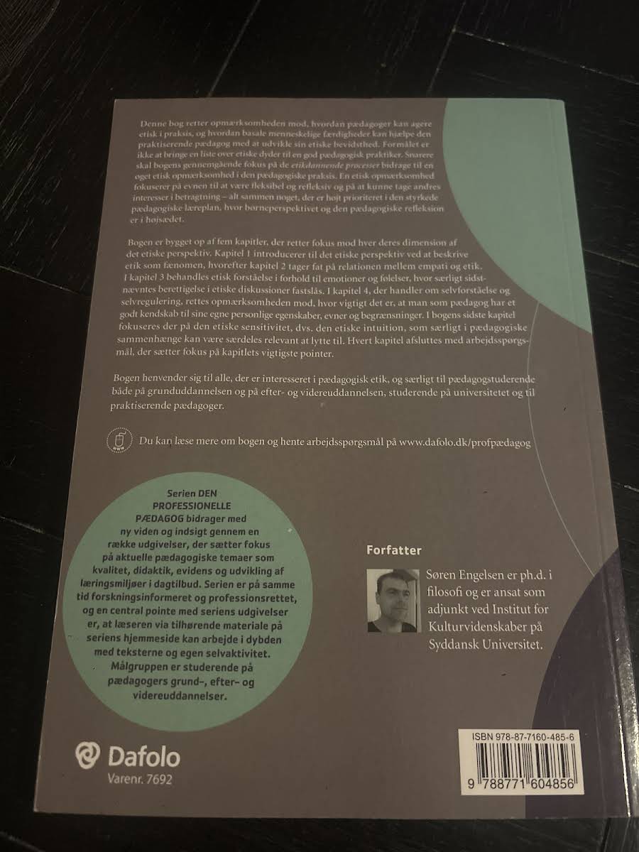 "Etiske færdigheder i pædagogisk praksis" af Søren Engelsen er en tankevækkende bog, der sætter fokus på de centrale kompetencer i den etik-dannende proces i pædagogiske sammenhænge. Bogen analyserer og gør forståelige, hvordan konkrete etiske færdigheder bidrager til udviklingen af et reflekteret, etisk perspektiv. Værket henvender sig til alle med interesse for pædagogisk etik, men er særligt relevant for studerende og praktikere inden for de pædagogiske professionsuddannelser, herunder professions-bachelorer, diplomstuderende i pædagogik samt på læreruddannelsen. Med sine 132 sider byder bogen på et velafbalanceret indblik i, hvordan etiske overvejelser kan berige den pædagogiske praksis.