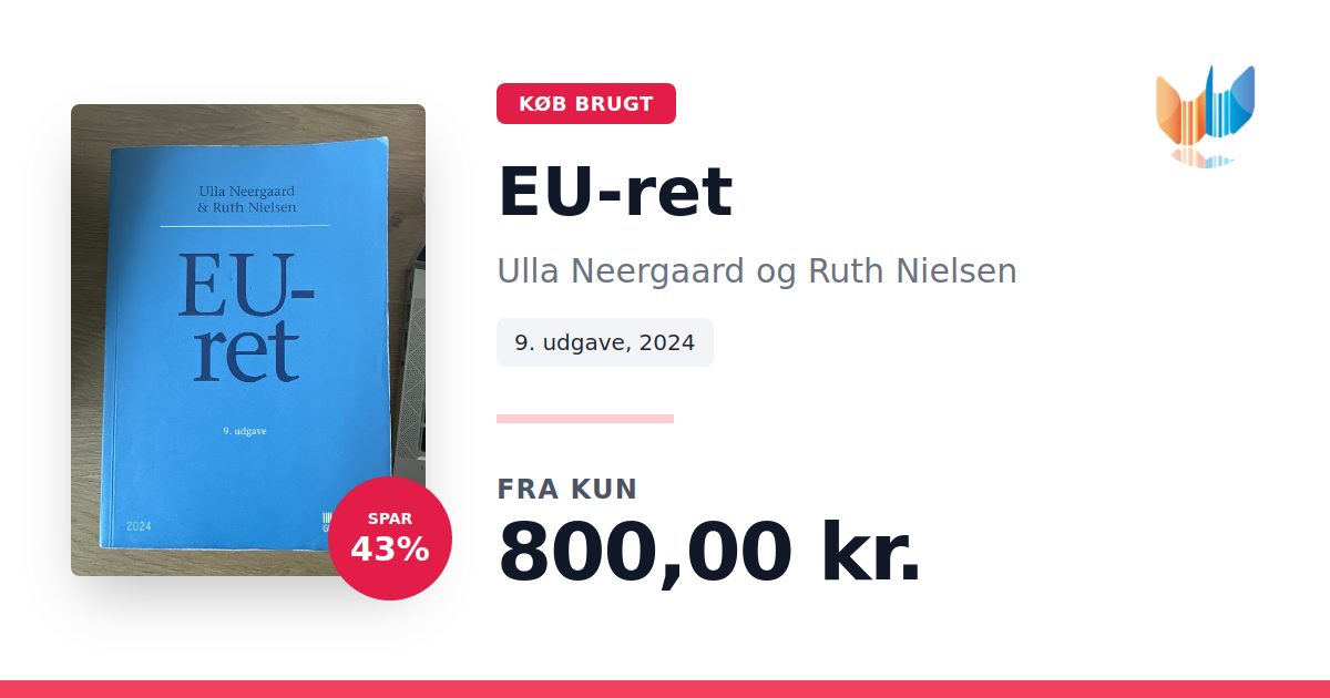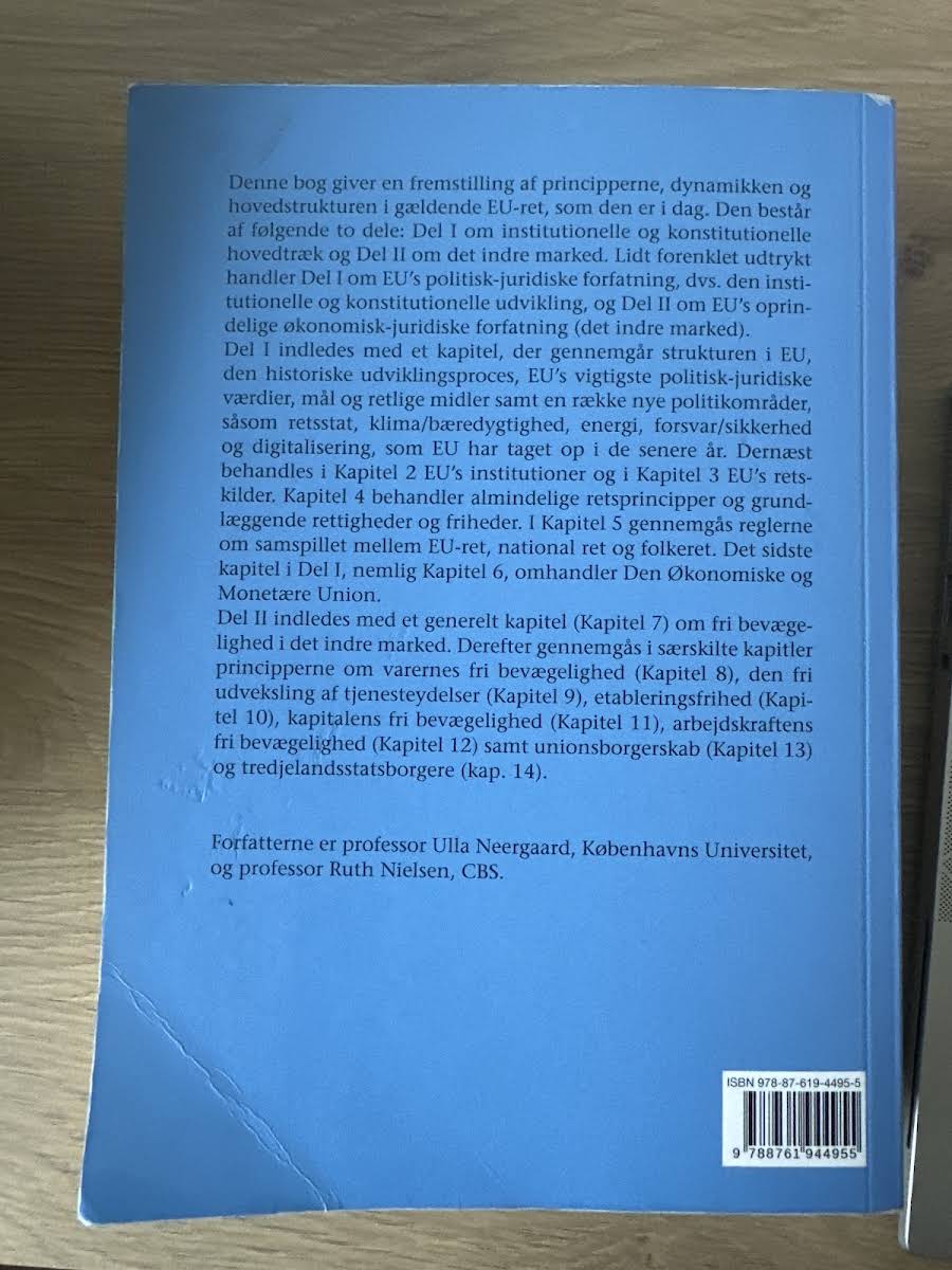 Nyt i 9. udgave Denne udgave viderefører og opdaterer 8. udgave fra 2020 og giver et aktuelt billede af EU-rettens principper, dynamik og hovedstruktur per primo 2024. Ved hjælp af retsdogmatisk metode og med udgangspunkt i europæisk realistisk retspositivisme præsenteres både grundlæggende teorier og praktiske sammenhænge i gældende EU-ret. Bogen er opdelt i to hoveddele: Del I om de institutionelle og konstitutionelle hovedtræk, og Del II om det indre marked og fri bevægelighed. Del I behandler EU’s opbygning og historiske udvikling, nøgleværdier og retlige instrumenter, herunder nye politikområder som retsstat, klima og bæredygtighed, energi, forsvar samt digitalisering. Desuden gennemgås EU’s institutioner, retskilder, almindelige retsprincipper, grundlæggende rettigheder samt samspillet mellem EU-ret, national ret og folkeret og Den Økonomiske og Monetære Union. Del II giver en systematisk indføring i fri bevægelighed i det indre marked med særskilte kapitler om varer, tjenesteydelser, etableringsfrihed, kapitalens og arbejdskraftens fri bevægelighed samt unionsborgerskab og tredjelandsstatsborgere. Målgruppe EU-ret henvender sig til studerende og undervisere på jurastudiet og fungerer tillige som opslagsværk og reference for advokater, dommere, embedsmænd, journalister og andre, der har behov for en grundlæggende og opdateret indsigt i EU-rettens struktur og virke. Forfattere Ruth Nielsen og Ulla Neergaard står bag værket. Ulla Neergaard er professor i EU-ret ved Juridisk Fakultet, Københavns Universitet.