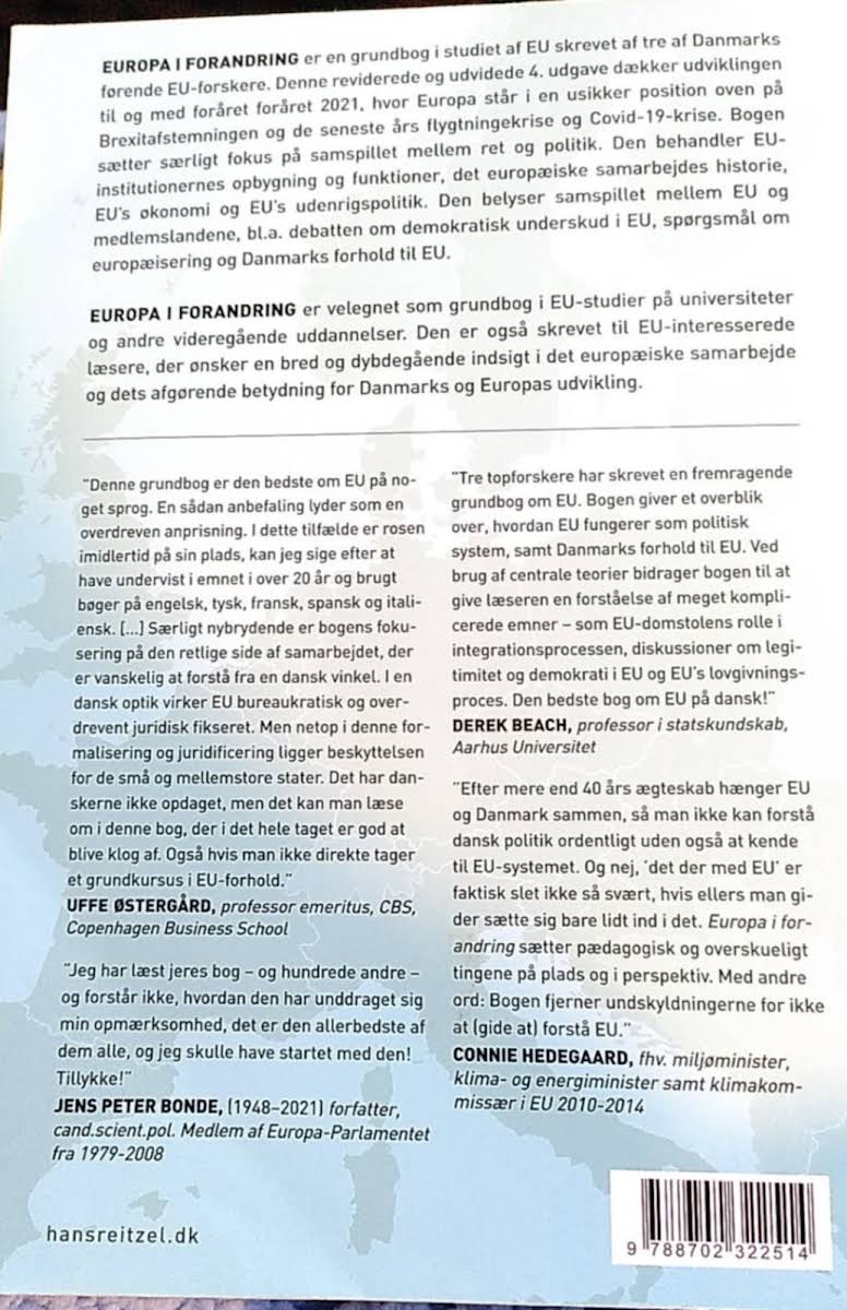 Europa i forandring er en central grundbog til studiet af EU, forfattet af tre af Danmarks førende EU-forskere. I den fjerde udgave, der dækker udviklingen frem til foråret 2021, analyseres de komplekse forandringer, Europa har gennemgået i kølvandet på Brexitafstemningen, flygtningekrisen og de seneste konsekvenser af Covid-19. Bogen lægger vægt på samspillet mellem ret og politik og giver en indgående redegørelse for EU’s institutionelle opbygning, den historiske udvikling i samarbejdet, samt de aktuelle debatter omkring europæiseringen og demokratisk underskud. Den undersøger desuden, hvordan EU’s økonomi og udenrigspolitik påvirker medlemslandenes forhold til unionen. Med sit brede og dybdegående indhold er Europa i forandring et uundværligt redskab for studerende og alle, der ønsker at forstå de politiske og retlige mekanismer, der former Danmarks og Europas fremtid.