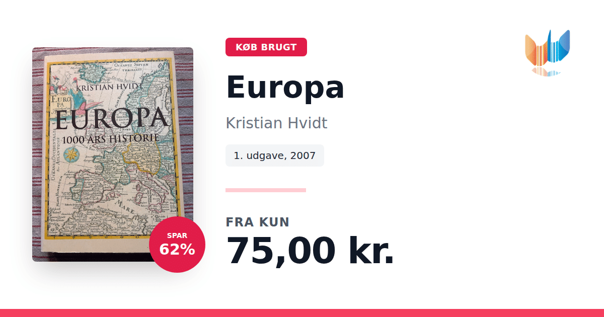 Lige nu kan du købe "Europa" af Kristian Hvidt til kun 75,00 kr. Du sparer hele 62% af nyprisen! Bogen du ser her er brugt, og i perfekt stand. Vi har i øjeblikket 2 eksemplarer til salg af "Europa", så husk at se de forskellige udgaver.
