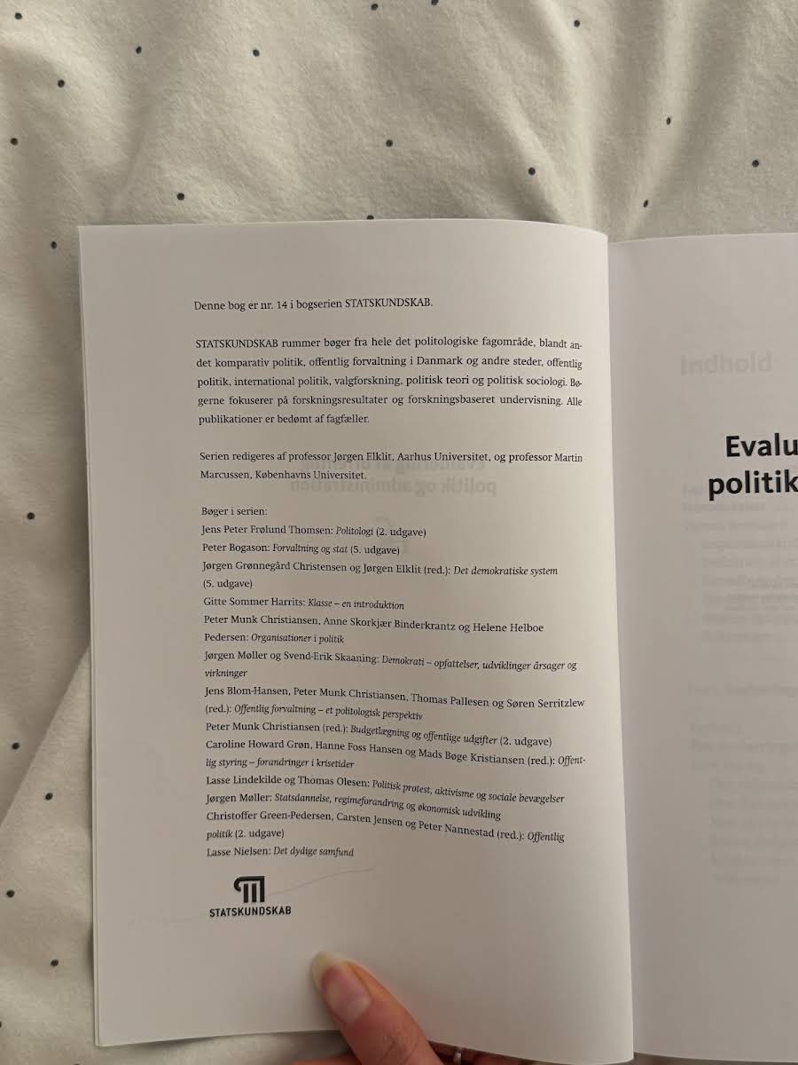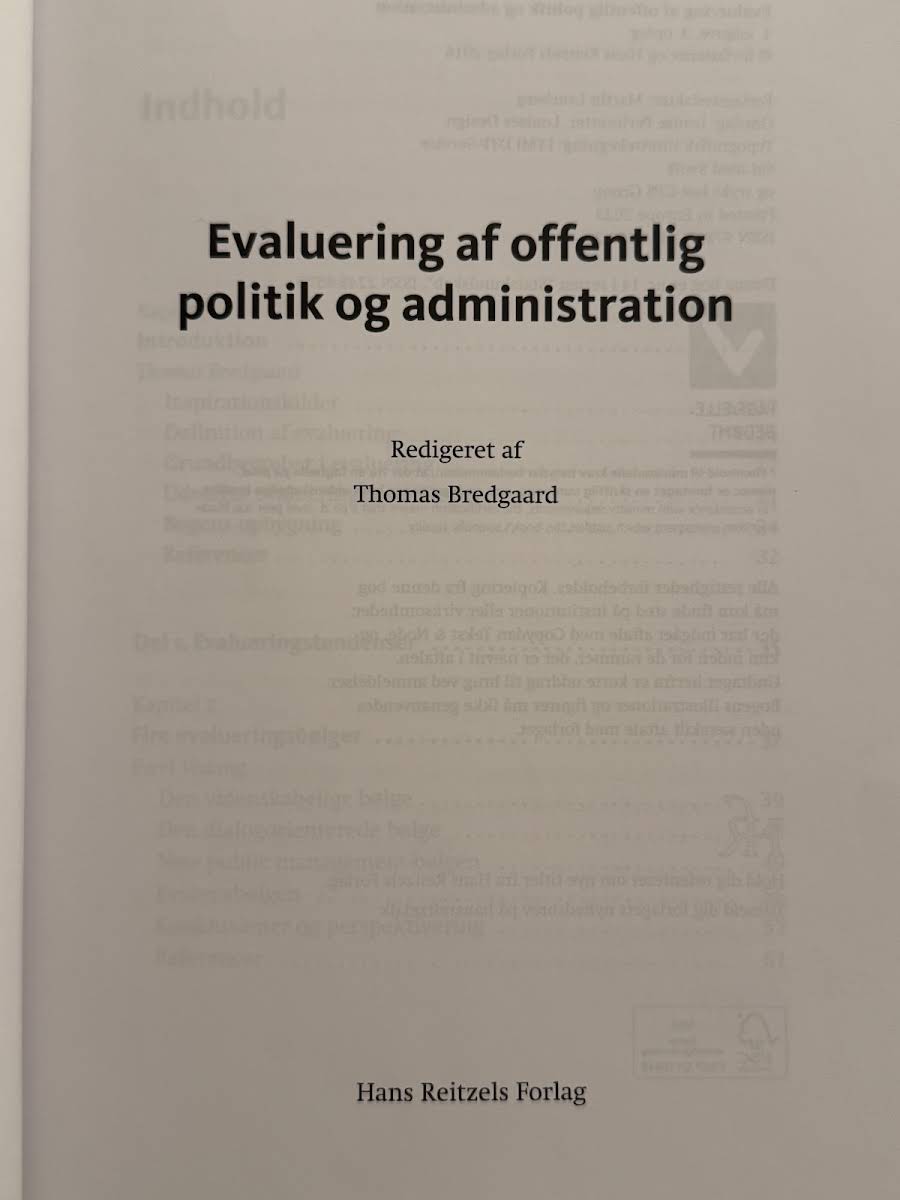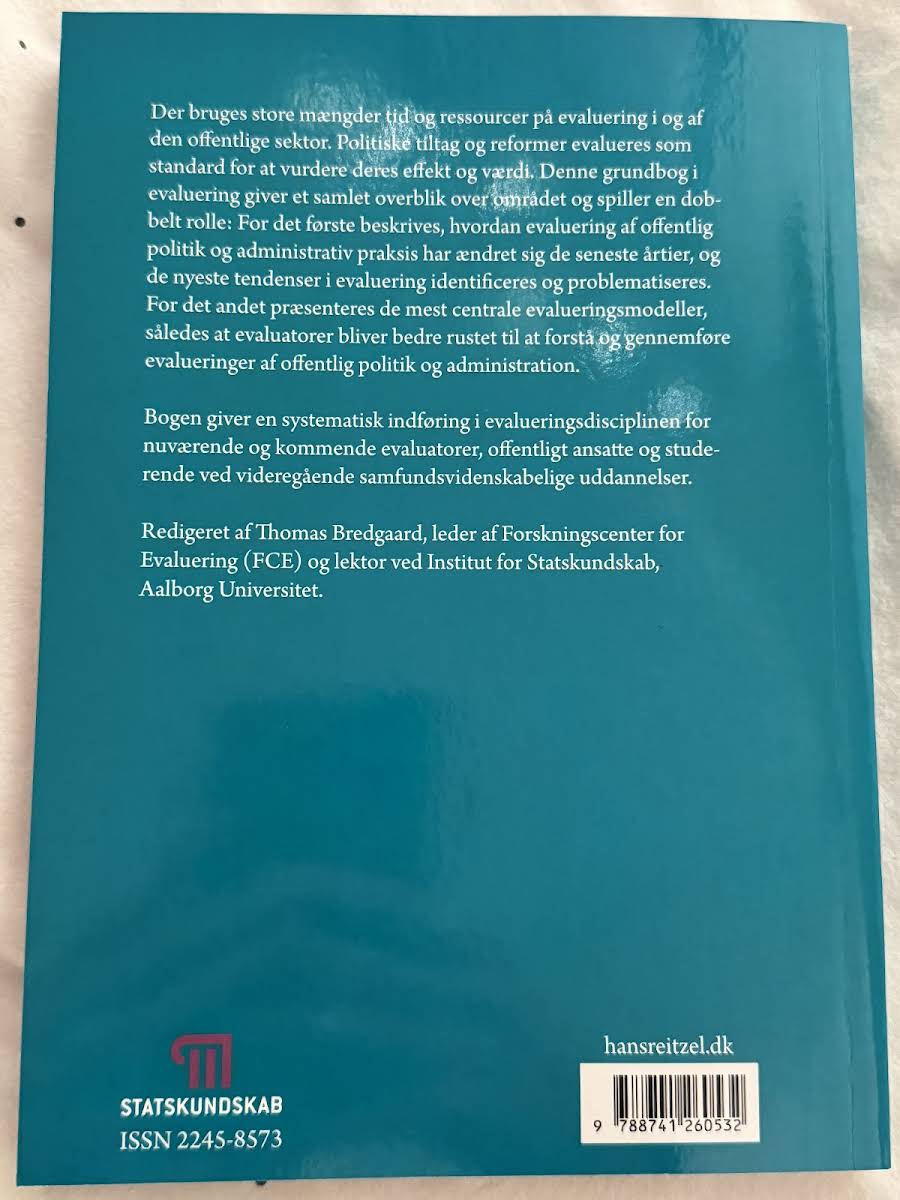 Evaluering af offentlig politik og administration giver en grundig og praktisk introduktion til de metoder og redskaber, der anvendes i evalueringen af offentlige tiltag og reformer. Bogen præsenterer, hvordan evalueringspraksis har udviklet sig i takt med de politiske forandringer, og hvordan denne udvikling påvirker både den administrative praksis og den politiske beslutningsproces. Bogen henvender sig til både studerende og praktiserende evaluatorer samt offentlig ansatte, der skal bestille evalueringer. Ved at kombinere teoretiske perspektiver med konkrete eksempler fremstår værket som en essentiel guide, der understøtter forståelsen af evalueringens rolle i den offentlige sektor. Udgivet af Hans Reitzels Forlag i 2016 leverer Evaluering af offentlig politik og administration et værdifuldt overblik over de mest anvendte evalueringsteknikker og de skiftende paradigmer inden for evaluering af politik og administration.