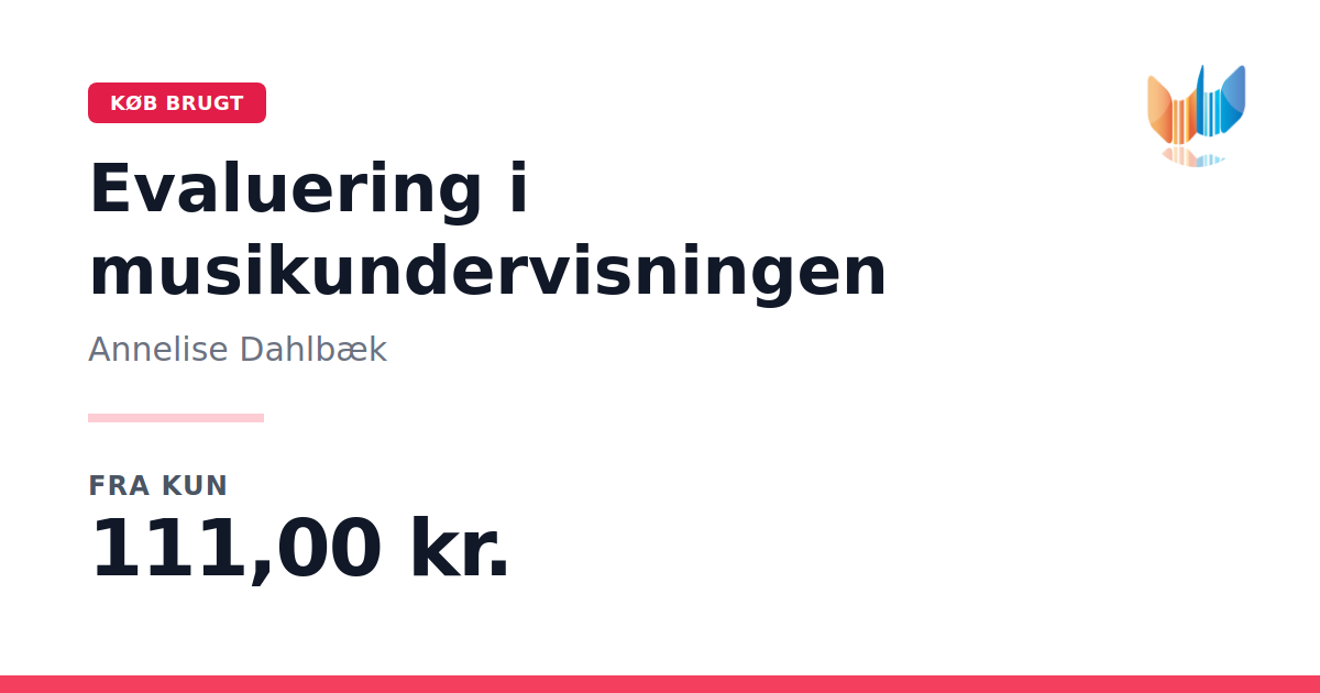 Lige nu kan du købe "Evaluering i musikundervisningen" af Annelise Dahlbæk til kun 111,00 kr. Du sparer hele 63% af nyprisen! Bogen du ser her er brugt, og i perfekt stand. Vi har i øjeblikket kun et enkelt eksemplar til salg af "Evaluering i musikundervisningen", så slå til mens du kan!