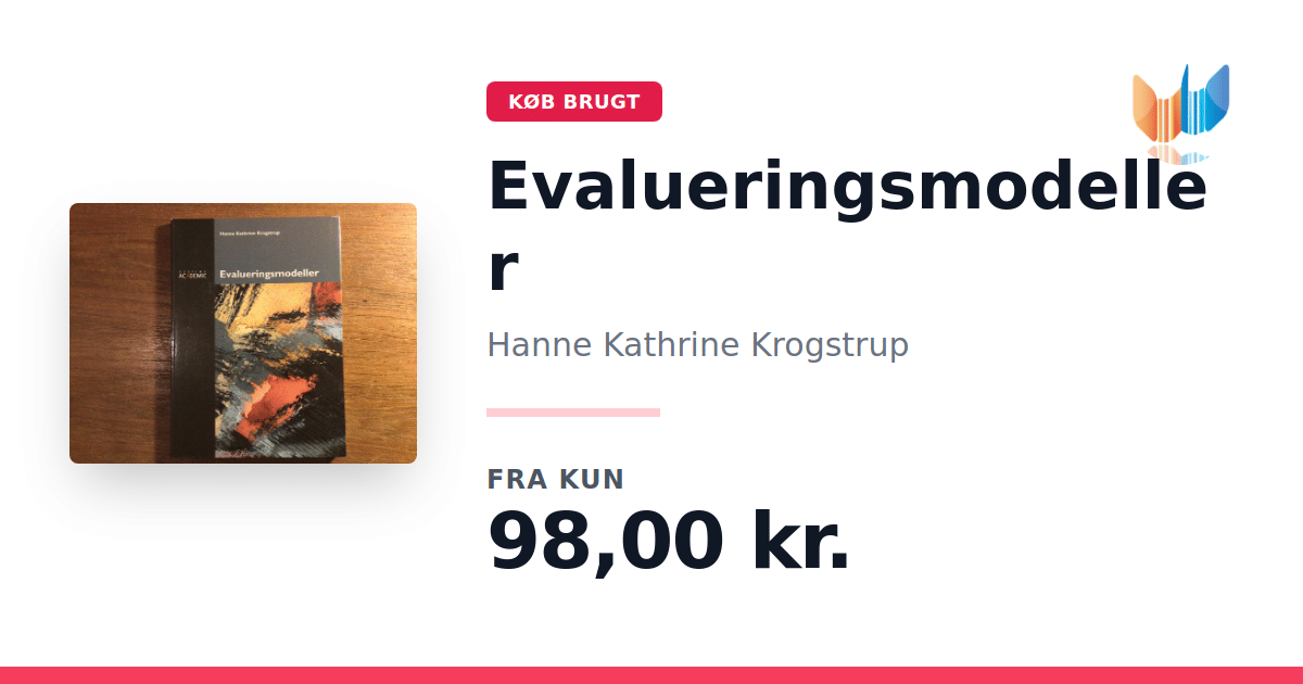 Lige nu kan du købe "Evalueringsmodeller" af Hanne Kathrine Krogstrup til kun 98,00 kr. Bogen du ser her er brugt, og i perfekt stand. Vi har i øjeblikket 4 eksemplarer til salg af "Evalueringsmodeller", så husk at se de forskellige udgaver.