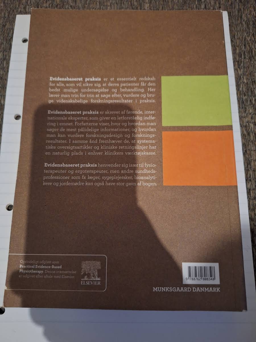 "Evidensbaseret praksis" er en trin-for-trin vejledning, der hjælper sundhedsprofessionelle med at omsætte videnskabelig forskning til praksis. Bogen giver en klar og grundig introduktion til, hvordan man systematisk søger efter og vurderer evidens – et afgørende redskab for at sikre en optimal behandling af patienten. Med fokus på de sundhedsvidenskabelige kernespørgsmål præsenterer forfatterne en konkret metode til at analysere forskningsdesign og -resultater. Selvom bogen især er rettet mod fysioterapeuter og ergoterapeuter, er dens indsigter og værktøjer også brugbare for læger, sygeplejersker, bioanalytikere og jordemødre. "Evidensbaseret praksis" giver læseren den nødvendige håndværksmæssige tilgang til at bygge bro mellem evidens i teori og praktisk klinisk anvendelse.