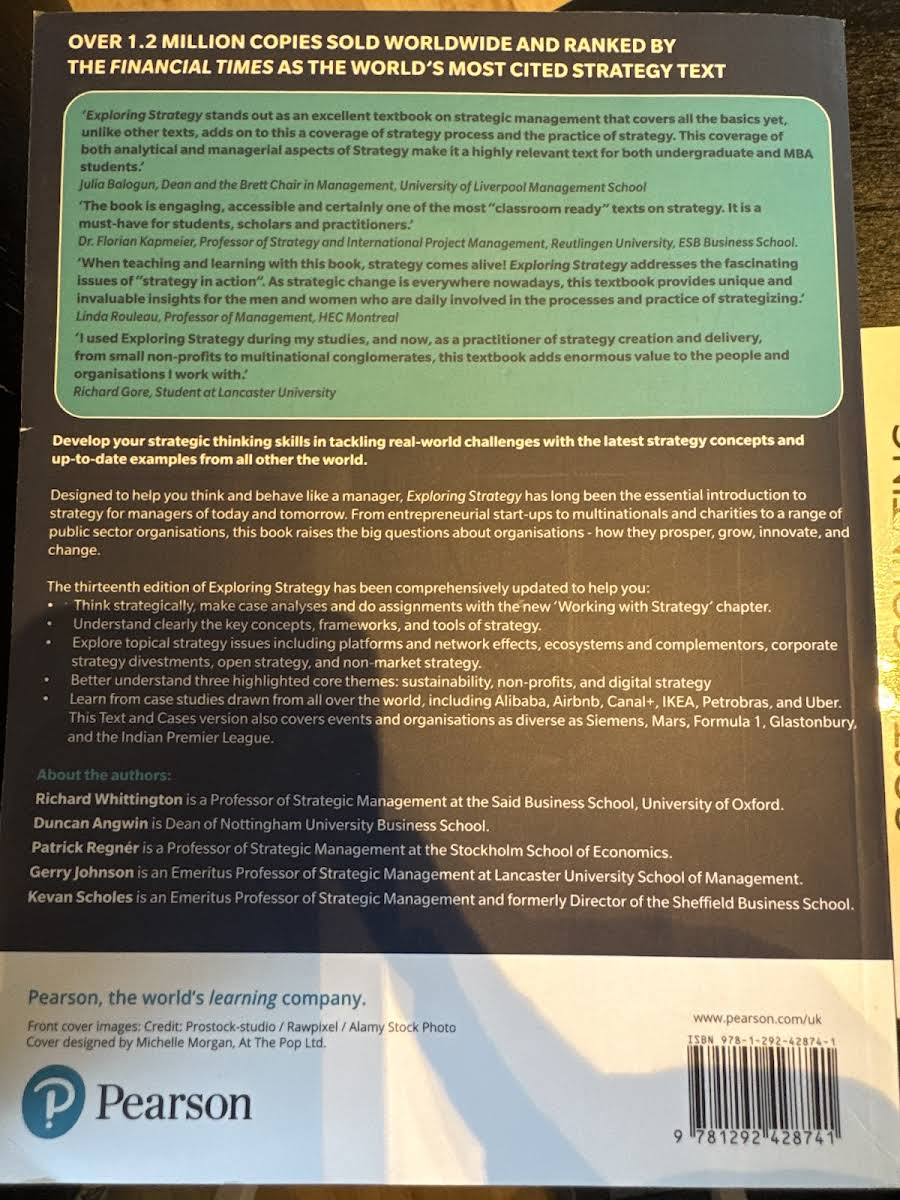 The 13th edition of Exploring Strategy, Text & Cases is an essential resource designed to equip today’s and tomorrow’s managers with the tools to understand and shape strategic thinking. Authored by Richard Whittington, Patrick Regnér, Duncan Angwin, Gerry Johnson, and Kevan Scholes, this updated edition delves into the pivotal questions of how organizations prosper, grow, innovate, and adapt in an ever-changing environment. Revised to reflect the latest developments in the field, the text bridges the gap between theory and practice by integrating a wealth of case studies that illuminate real-world challenges. Covering a diverse range of organizations - from entrepreneurial start-ups and multinationals to charities and governmental agencies - the book offers readers a comprehensive perspective on the evolving nature of strategic management. New to this edition is the chapter "Working with Strategy," which guides readers through advanced case analysis and strategic assignments. In addition, the text highlights three core themes: sustainability, non-profits, and digital strategy. Through engaging case studies featuring renowned global organizations such as Alibaba, Airbnb, Amazon, Alphabet, IKEA, and Uber, alongside insights into events and entities like Siemens, Mars, Formula 1, Glastonbury, and the Indian Premier League, this edition invites you to explore strategy in its dynamic, real-world context.