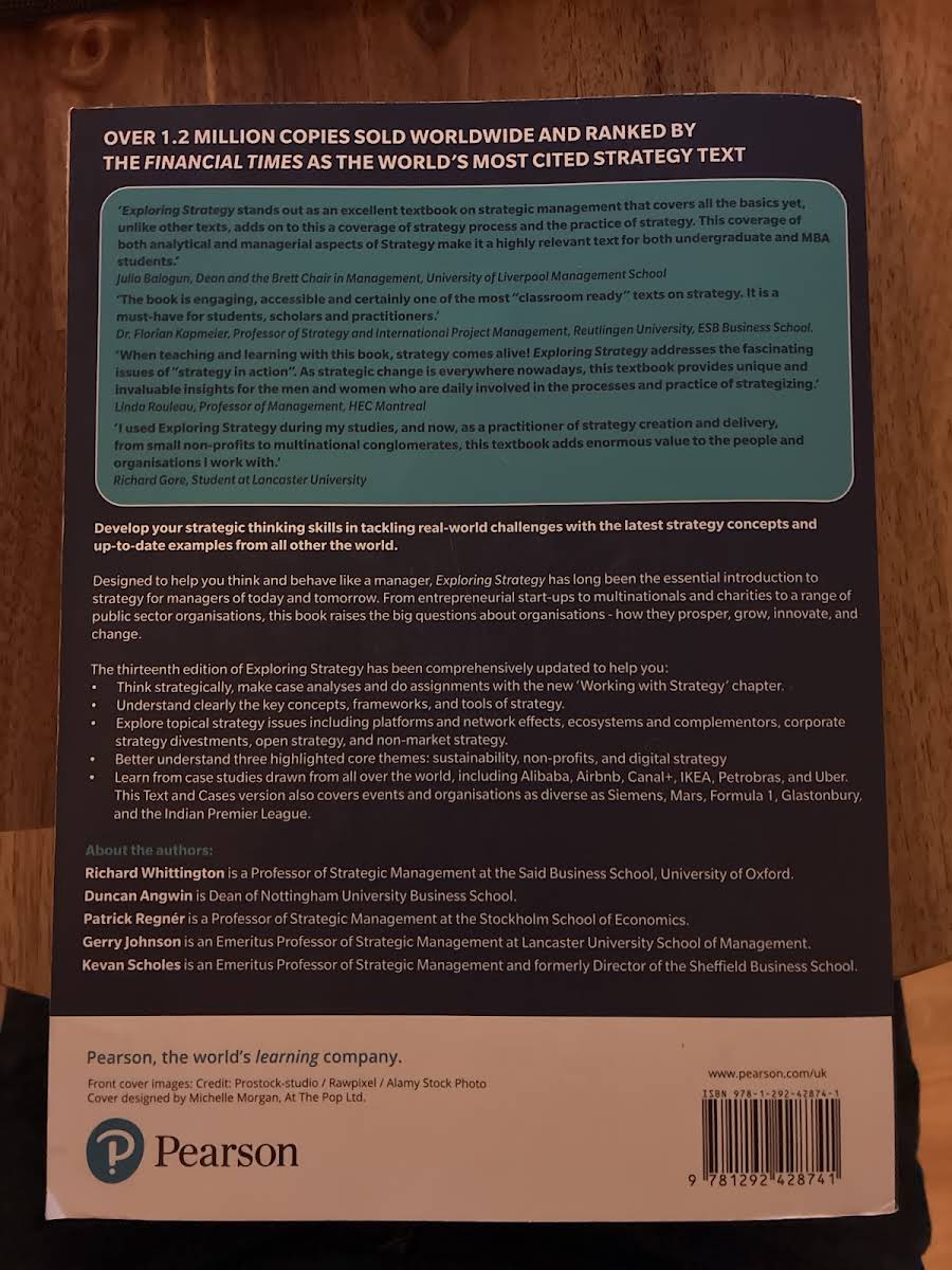 The 13th edition of Exploring Strategy, Text & Cases is an essential resource designed to equip today’s and tomorrow’s managers with the tools to understand and shape strategic thinking. Authored by Richard Whittington, Patrick Regnér, Duncan Angwin, Gerry Johnson, and Kevan Scholes, this updated edition delves into the pivotal questions of how organizations prosper, grow, innovate, and adapt in an ever-changing environment. Revised to reflect the latest developments in the field, the text bridges the gap between theory and practice by integrating a wealth of case studies that illuminate real-world challenges. Covering a diverse range of organizations - from entrepreneurial start-ups and multinationals to charities and governmental agencies - the book offers readers a comprehensive perspective on the evolving nature of strategic management. New to this edition is the chapter "Working with Strategy," which guides readers through advanced case analysis and strategic assignments. In addition, the text highlights three core themes: sustainability, non-profits, and digital strategy. Through engaging case studies featuring renowned global organizations such as Alibaba, Airbnb, Amazon, Alphabet, IKEA, and Uber, alongside insights into events and entities like Siemens, Mars, Formula 1, Glastonbury, and the Indian Premier League, this edition invites you to explore strategy in its dynamic, real-world context.
