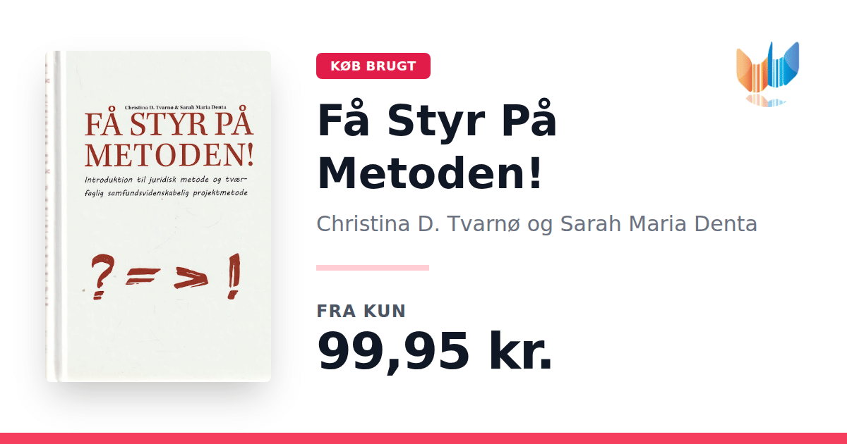 Lige nu kan du købe "Få Styr På Metoden!" af Christina D. Tvarnø og Sarah Maria Denta til kun 99,95 kr. Bogen du ser her er brugt, og i perfekt stand. Vi har i øjeblikket 2 eksemplarer til salg af "Få Styr På Metoden!", så husk at se de forskellige udgaver.