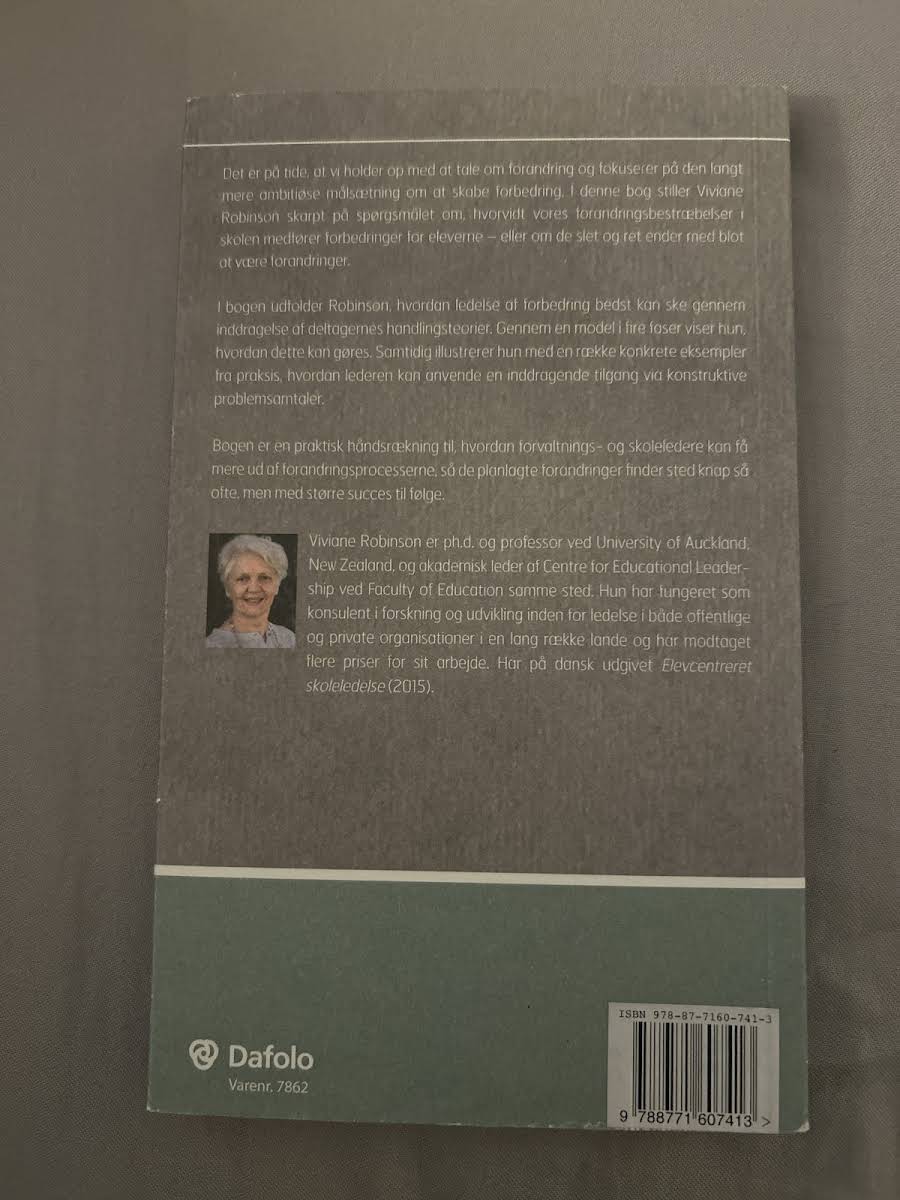 I "Færre forandringer, flere forbedringer" stiller Viviane Robinson skarpt på, at forandring sjældent i sig selv garanterer forbedringer i skolens hverdag. Med udgangspunkt i en inddragende og konstruktiv ledelsesmodel i fire faser, belyser hun, hvordan en systematisk og reflekteret tilgang kan skabe varige forbedringer for både elever og personale. Gennem en kombination af teoretiske perspektiver og illustrative eksempler fra praksis, viser bogen vejen til en ledelse, hvor forandringsprocesser ikke blot er hyppige, men vellykkede. Denne praksisorienterede tilgang gør "Færre forandringer, flere forbedringer" til et værdifuldt redskab for ledere i skolens verden, der ønsker at omsætte ambitioner til konkrete resultater.