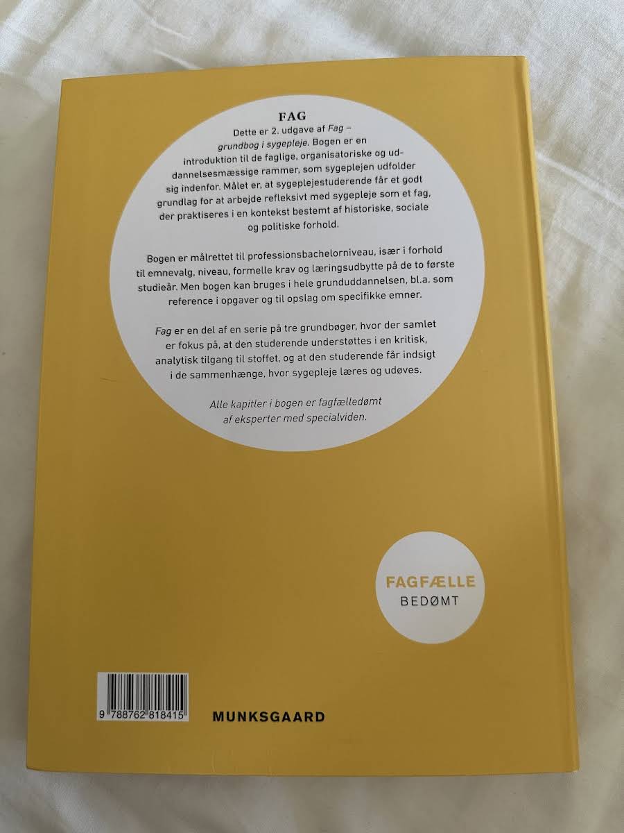 Fag – Grundbog i sygepleje i 2. udgave giver sygeplejestuderende et solidt fundament, hvor de faglige, organisatoriske og uddannelsesmæssige rammer for sygepleje præsenteres og reflekteres over. Bogen understøtter en kritisk og analytisk tilgang til stoffet og giver læseren indsigt i, hvordan sygepleje udøves i en historisk, social og politisk kontekst. Målrettet studerende på professionsbachelorniveau, især i de to første studieår, fungerer denne grundbog ikke kun som et læremiddel men også som et værdifuldt opslagsværk for senere studier og faglige opgaver. Bogen er nøje sammensat af eksperter med specialviden og indgår i en tre-binds serie, der tilsammen understøtter den teoretiske og praktiske forståelse af sygeplejefaget.