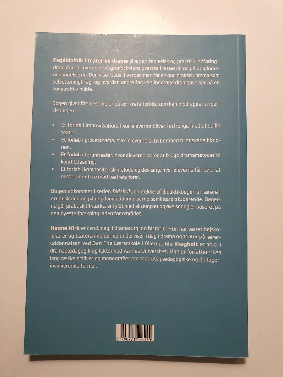 Fagdidaktik i teater og drama giver en teoretisk og praktisk indføring i dramafagets metoder på grundskolens øverste klassetrin og på ungdomsuddannelserne. Bogen belyser, hvordan drama kan fungere som et selvstændigt fag, samtidig med at andre fag integrerer dramaøvelser på en meningsfuld måde. Forfatterne introducerer fire detaljerede undervisningsforløb: - Et improvisationsforløb, hvor eleverne opbygger fortrolighed med teaterspilllets grundelementer. - Et procesdrama, hvor deltagerne selv bidrager til at skabe og udvikle fiktionen. - Et forumteater, hvor dramametoder anvendes som redskab til konfliktløsning. - Et kompositorisk forløb og devising, hvor eksperimentering med teatrets former står i centrum. Hanne Kirk er cand.mag. i dramaturgi og historie og underviser i drama og teater på Den Frie Lærerskole i Ollerup. Ida Krøgholt er ph.d. i dramapædagogik og lektor ved Aarhus Universitet. Derudover bidrager Johanne Winding Nordestgaard, dramalærer på Egaa Gymnasium, samt teaterunderviser Astrid Guldhammer. Bogen indgår i Frydenlunds didaktikserie - forskningsbaserede praksisbøger til lærere og lærerstuderende fyldt med konkrete eksempler, øvelser og aktuel teori.