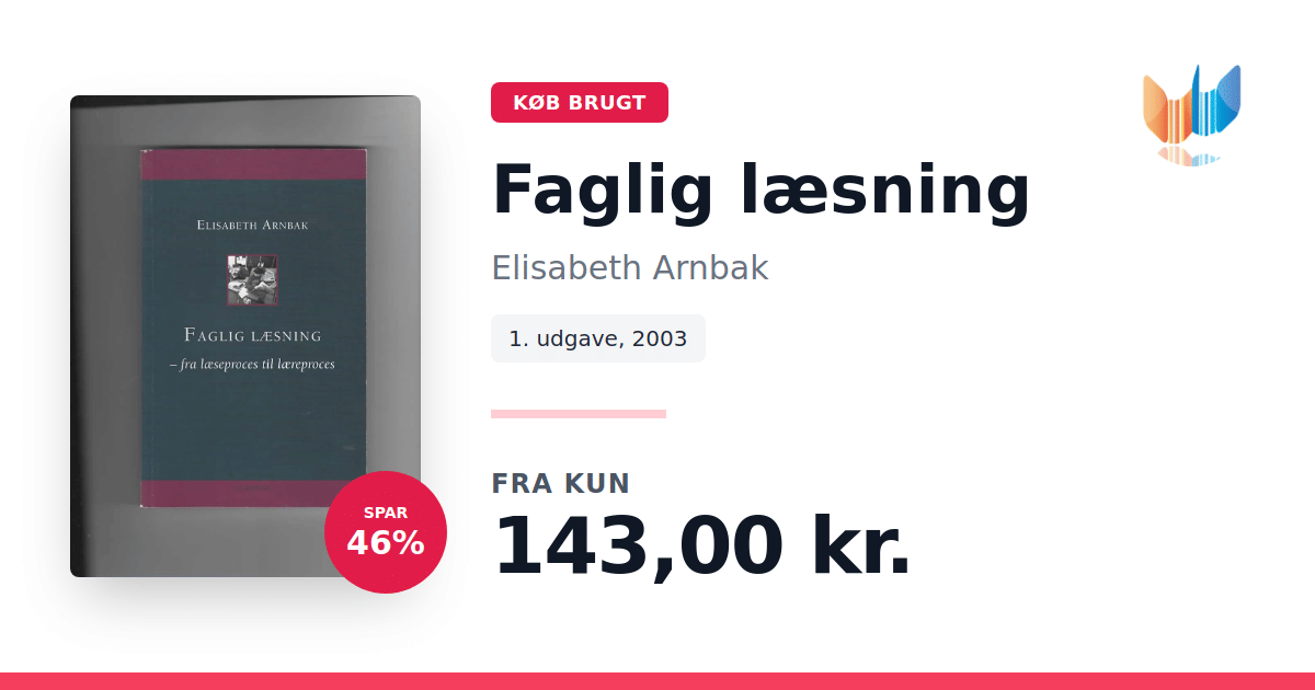 Lige nu kan du købe "Faglig læsning" af Elisabeth Arnbak til kun 143,00 kr. Du sparer hele 46% af nyprisen! Bogen du ser her er brugt, og i perfekt stand. Vi har i øjeblikket 3 eksemplarer til salg af "Faglig læsning", så husk at se de forskellige udgaver.
