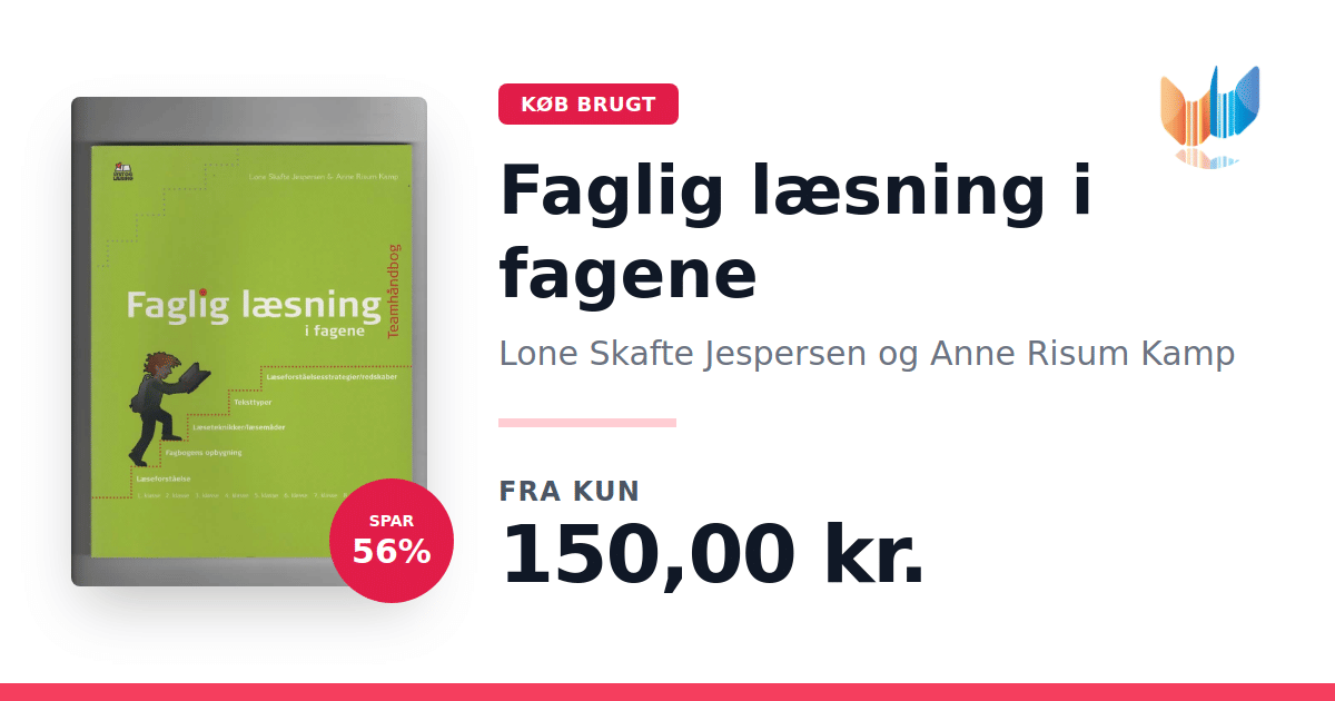 Lige nu kan du købe "Faglig læsning i fagene" af Lone Skafte Jespersen og Anne Risum Kamp til kun 150,00 kr. Du sparer hele 56% af nyprisen! Bogen du ser her er brugt, og i perfekt stand. Vi har i øjeblikket 3 eksemplarer til salg af "Faglig læsning i fagene", så husk at se de forskellige udgaver.