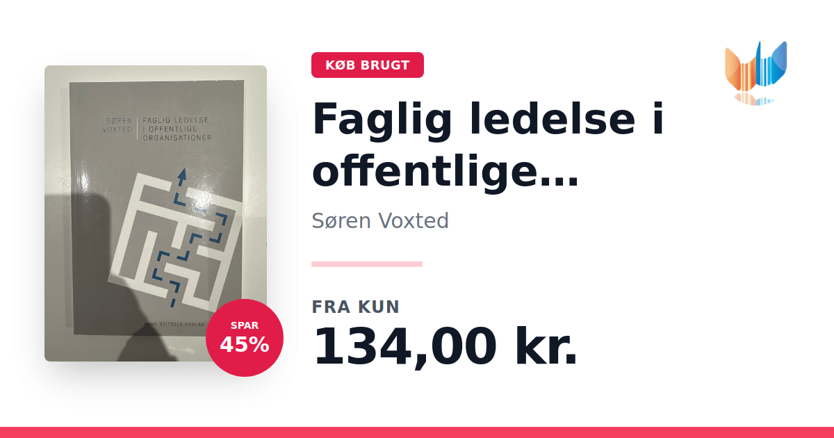 Lige nu kan du købe "Faglig ledelse i offentlige organisationer" af Søren Voxted til kun 134,00 kr. Du sparer hele 45% af nyprisen! Bogen du ser her er brugt, og i perfekt stand. Vi har i øjeblikket 2 eksemplarer til salg af "Faglig ledelse i offentlige organisationer", så husk at se de forskellige udgaver.