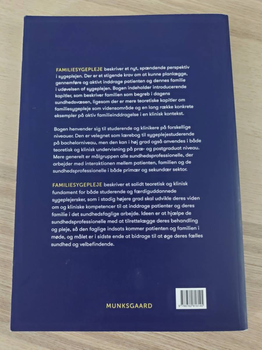 "Familiesygepleje" præsenterer et solidt teoretisk og klinisk fundament, som gør den til et uvurderligt redskab for både studerende og færdiguddannede sygeplejersker. Bogen sætter fokus på den stærke sammenhæng mellem patient- og familieinvolvering og de sundhedsfaglige kompetencer, der kræves i den moderne sygepleje. Med et spændende perspektiv på inddragelsen af patienten og dennes familie, rummer bogen en række centrale metoder og tilgange, der er anvendelige på både bachelor- og postgraduate niveau. "Familiesygepleje" henvender sig bredt til sundhedsprofessionelle, der arbejder i både primær og sekundær sektor, og giver en opdateret tilgang til, hvordan man bedst understøtter den tætte interaktion mellem patient, familie og plejepersonale.
