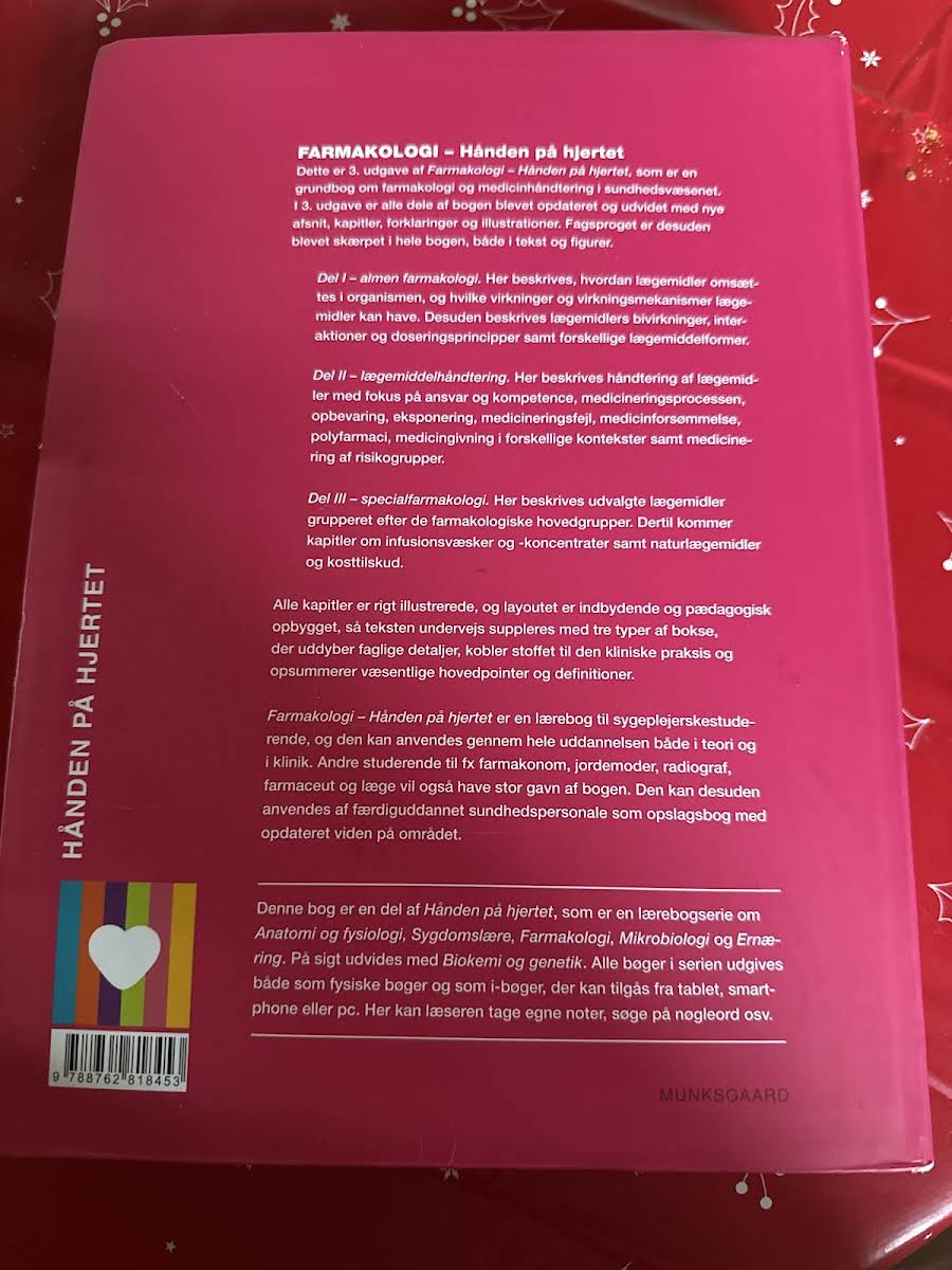 3. udgave af Farmakologi – Hånden på hjertet præsenterer en omfattende og ajourført introduktion til farmakologi og korrekt håndtering af lægemidler. Med 714 sider byder bogen på nye afsnit, kapitler og illustrationer, der hver især understøtter fagsproget og den kliniske relevans. Bogen er inddelt i tre hoveddele, hvor Del I omhandler almen farmakologi med fokus på lægemidlers optagelse, omsætning og virkningsmekanismer i kroppen. Del II fokuserer på modern medicinhåndtering, med vægt på ansvarsområder, doseringsprincipper og forebyggelse af medicineringsfejl i sundhedsvæsenet. Del III dykker ned i specialfarmakologi og giver et detaljeret indblik i de forskellige lægemiddelgruppers særlige egenskaber, herunder praktiske betragtninger om infusionsvæsker, naturlægemidler og kosttilskud. Den pædagogiske opbygning med fokuserede bokse, der fremhæver nøgleinformation og kliniske perspektiver, gør bogen særlig velegnet både til studerende og fagfolk.
