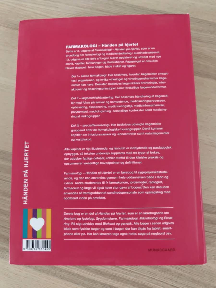 3. udgave af Farmakologi – Hånden på hjertet præsenterer en omfattende og ajourført introduktion til farmakologi og korrekt håndtering af lægemidler. Med 714 sider byder bogen på nye afsnit, kapitler og illustrationer, der hver især understøtter fagsproget og den kliniske relevans. Bogen er inddelt i tre hoveddele, hvor Del I omhandler almen farmakologi med fokus på lægemidlers optagelse, omsætning og virkningsmekanismer i kroppen. Del II fokuserer på modern medicinhåndtering, med vægt på ansvarsområder, doseringsprincipper og forebyggelse af medicineringsfejl i sundhedsvæsenet. Del III dykker ned i specialfarmakologi og giver et detaljeret indblik i de forskellige lægemiddelgruppers særlige egenskaber, herunder praktiske betragtninger om infusionsvæsker, naturlægemidler og kosttilskud. Den pædagogiske opbygning med fokuserede bokse, der fremhæver nøgleinformation og kliniske perspektiver, gør bogen særlig velegnet både til studerende og fagfolk.