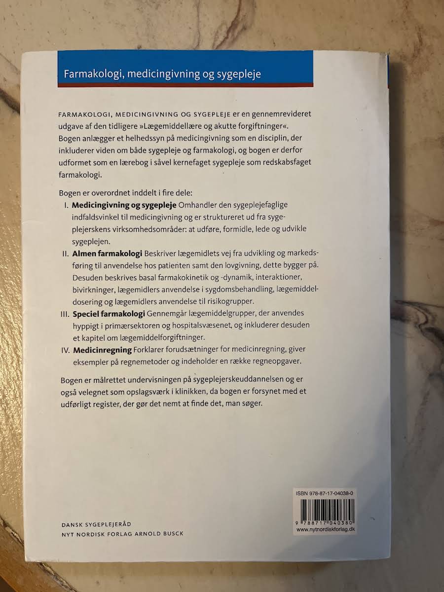 "Farmakologi, medicingivning og sygepleje" er et omhyggeligt revideret fagligt værk af Iben Lovring, Hanne Rasmussen, Gesche Jürgens, Lene Ørskov Reuther og Vivi Brandt Rasmussen. Værket bygger videre på tidligere udgaver og byder på opdateret indhold samt nye kapitler, der alle styrker læserens forståelse for de centrale principper i farmakologi og medicingivning. Bogen er struktureret i fire klart definerede sektioner, hvor den første del introducerer de grundlæggende metoder og tilgange i forbindelse med administration af medicin i sygeplejen. Efterfølgende dykker den anden del ned i den generelle farmakologi, mens den tredje udvider perspektivet med fokus på den specialiserede farmakologi. Det fjerde og sidste afsnit udgør et nyt tiltag, hvor der blandt andet præsenteres et dedikeret kapitel om medicinregning samt praktiske regneopgaver. Med sin omfattende opdeling og opdaterede indhold er bogen et uundværligt redskab for både studerende og praktiserende sygegeplejersker, der ønsker en dybdegående og anvendelsesorienteret tilgang til faget.
