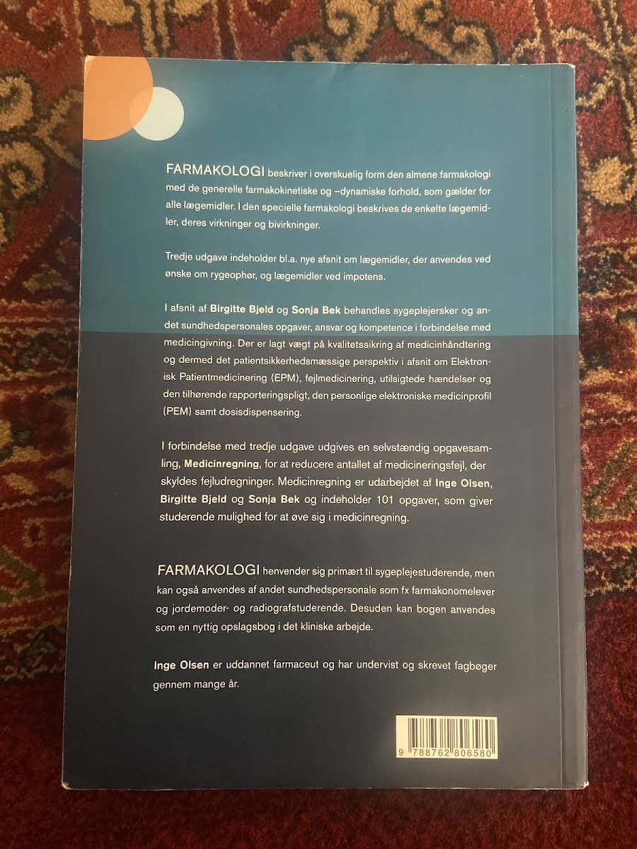 Farmakologi, 6. udgave, giver en grundig indføring i de centrale principper for lægemiddelvirkning. Bogen redegør for de farmakokinetiske og farmakodynamiske forhold og præsenterer de enkelte lægemidler, deres virkningsmekanismer og bivirkninger. Med en klar kombination af teoretiske og kliniske perspektiver understreges vigtigheden af medicinsikkerhed samt den sygeplejerskemæssige rolle i forbindelse med medicinadministration. Bogen henvender sig primært til sygeplejestuderende, men er også et værdifuldt redskab for farmakonomelever, jordemoderstuderende og radiografstuderende. Med bidrag fra Sonja Bek, Birgitte Bjeld og Inge Olsen, tilbyder denne udgave et opdateret og bredt fundament, der understøtter sundhedspersonalets daglige kliniske arbejde.