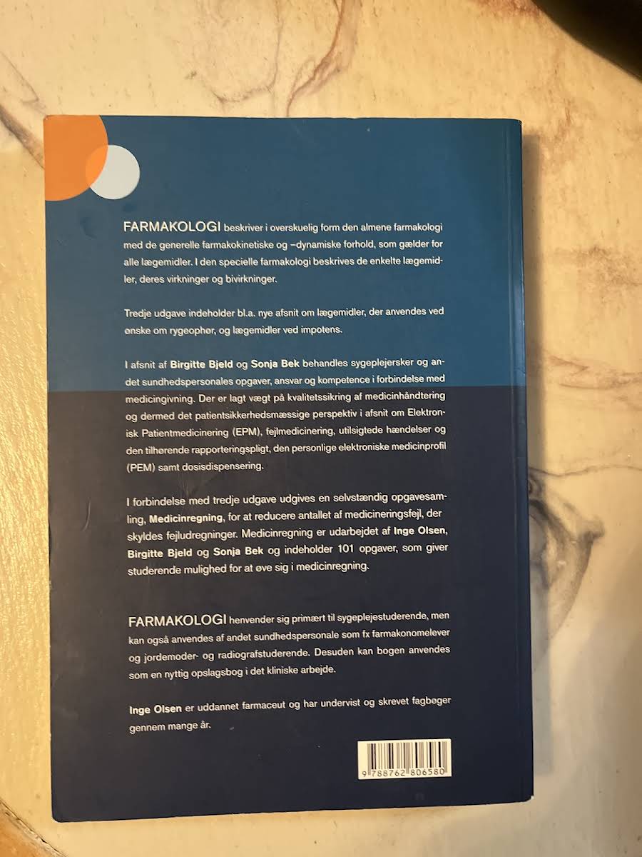 Farmakologi, 6. udgave, giver en grundig indføring i de centrale principper for lægemiddelvirkning. Bogen redegør for de farmakokinetiske og farmakodynamiske forhold og præsenterer de enkelte lægemidler, deres virkningsmekanismer og bivirkninger. Med en klar kombination af teoretiske og kliniske perspektiver understreges vigtigheden af medicinsikkerhed samt den sygeplejerskemæssige rolle i forbindelse med medicinadministration. Bogen henvender sig primært til sygeplejestuderende, men er også et værdifuldt redskab for farmakonomelever, jordemoderstuderende og radiografstuderende. Med bidrag fra Sonja Bek, Birgitte Bjeld og Inge Olsen, tilbyder denne udgave et opdateret og bredt fundament, der understøtter sundhedspersonalets daglige kliniske arbejde.