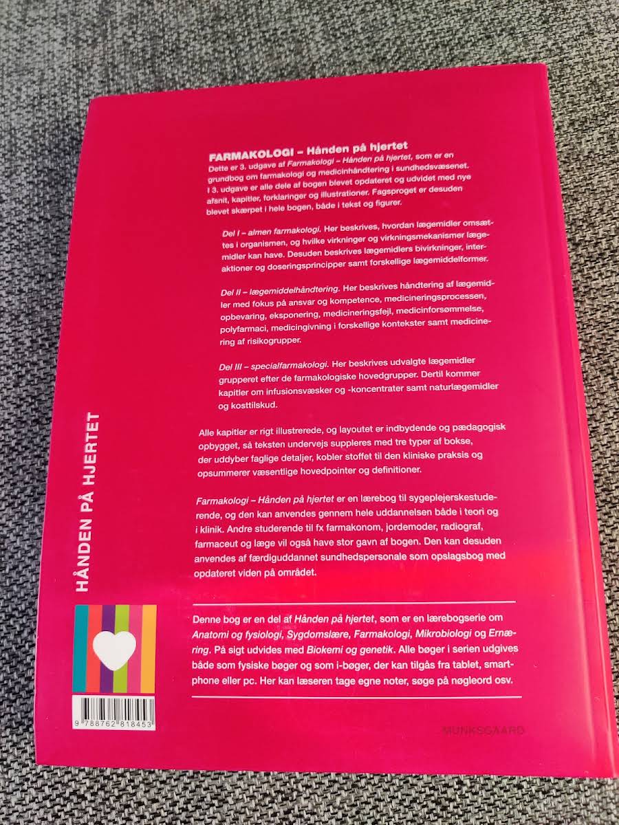 3. udgave af Farmakologi – Hånden på hjertet præsenterer en omfattende og ajourført introduktion til farmakologi og korrekt håndtering af lægemidler. Med 714 sider byder bogen på nye afsnit, kapitler og illustrationer, der hver især understøtter fagsproget og den kliniske relevans. Bogen er inddelt i tre hoveddele, hvor Del I omhandler almen farmakologi med fokus på lægemidlers optagelse, omsætning og virkningsmekanismer i kroppen. Del II fokuserer på modern medicinhåndtering, med vægt på ansvarsområder, doseringsprincipper og forebyggelse af medicineringsfejl i sundhedsvæsenet. Del III dykker ned i specialfarmakologi og giver et detaljeret indblik i de forskellige lægemiddelgruppers særlige egenskaber, herunder praktiske betragtninger om infusionsvæsker, naturlægemidler og kosttilskud. Den pædagogiske opbygning med fokuserede bokse, der fremhæver nøgleinformation og kliniske perspektiver, gør bogen særlig velegnet både til studerende og fagfolk.