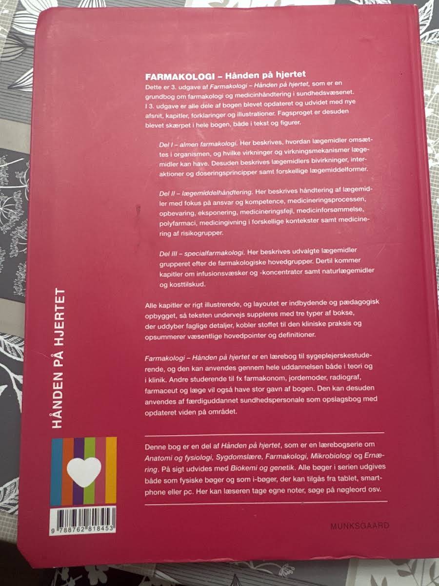 3. udgave af Farmakologi – Hånden på hjertet præsenterer en omfattende og ajourført introduktion til farmakologi og korrekt håndtering af lægemidler. Med 714 sider byder bogen på nye afsnit, kapitler og illustrationer, der hver især understøtter fagsproget og den kliniske relevans. Bogen er inddelt i tre hoveddele, hvor Del I omhandler almen farmakologi med fokus på lægemidlers optagelse, omsætning og virkningsmekanismer i kroppen. Del II fokuserer på modern medicinhåndtering, med vægt på ansvarsområder, doseringsprincipper og forebyggelse af medicineringsfejl i sundhedsvæsenet. Del III dykker ned i specialfarmakologi og giver et detaljeret indblik i de forskellige lægemiddelgruppers særlige egenskaber, herunder praktiske betragtninger om infusionsvæsker, naturlægemidler og kosttilskud. Den pædagogiske opbygning med fokuserede bokse, der fremhæver nøgleinformation og kliniske perspektiver, gør bogen særlig velegnet både til studerende og fagfolk.