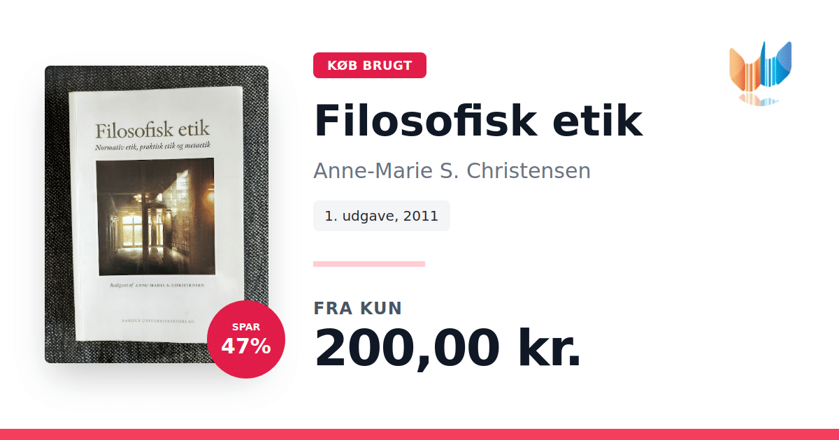 Lige nu kan du købe "Filosofisk etik" af Anne-Marie S. Christensen til kun 200,00 kr. Du sparer hele 47% af nyprisen! Bogen du ser her er brugt, og i god stand. Vi har i øjeblikket kun et enkelt eksemplar til salg af "Filosofisk etik", så slå til mens du kan!