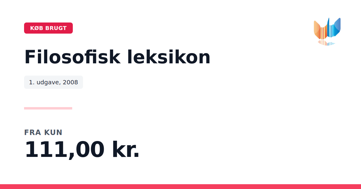 Lige nu kan du købe "Filosofisk leksikon" til kun 111,00 kr. Du sparer hele 74% af nyprisen! Bogen du ser her er brugt, og i god stand. Vi har i øjeblikket kun et enkelt eksemplar til salg af "Filosofisk leksikon", så slå til mens du kan!