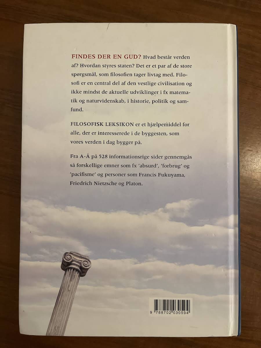 Filosofisk Leksikon er et moderne og detaljeret opslagsværk, der bringer et rigt overblik over de centrale begreber, ideer og retninger, der har præget vestlig tænkning gennem 2500 år. I samarbejde med en række anerkendte eksperter inden for filosofi, sociologi, psykologi og videnskabshistorie præsenterer leksikonet en alsidig samling af perspektiver – fra antikkens Grækenland til de seneste debatter i begyndelsen af det 21. århundrede. Bogen, udgivet af Gyldendal i 2008, kombinerer klar tekst med velvalgte illustrationer, der forklarer komplekse teorier og fremhæver bidrag fra store tænkere. Filosofisk Leksikon er et uundværligt redskab for studerende, forskere og alle med en interesse for den rige og varierende filosofihistorie.