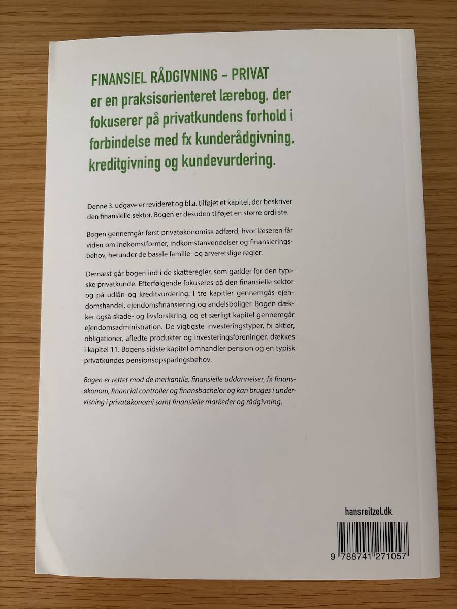 Finansiel rådgivning – privat præsenterer en praksisorienteret tilgang til de udfordringer, der er forbundet med privatkundens økonomi, rådgivning, kreditgivning og kundevurdering. I denne 3. udgave, der er opdateret med et helt nyt kapitel om den finansielle sektor, er fokus rettet mod de centrale elementer i privatøkonomisk adfærd. Læseren introduceres til forskellige indkomstformer, anvendelsen af indtægter samt de finansieringsbehov, der opstår, herunder de grundlæggende regler inden for familie- og arveret. Derudover er bogen beriget med en omfattende ordliste, der understøtter gennemgangen. Bogen bevæger sig videre til emner som de gældende skatteregler for den private kunde og dykker ned i den finansielle sektors rolle i udlån og kreditvurdering. Med tre kapitler dedikeret til ejendomshandel, ejendomsfinansiering og andelsboliger, suppleret af en gennemgang af skade- og livsforsikringer samt et særskilt kapitel om ejendomsadministration, opnås en bred forståelse af de finansielle processer. Bogsidens kapitler omfatter også de væsentligste investeringstyper samt afsluttende emner om pension og de typiske opsparingsbehov hos den private kunde. Denne lærebog er ideel for studerende inden for de merkantile og finansielle uddannelser, som blandt andet finansøkonom, financial controller og finansbachelor.