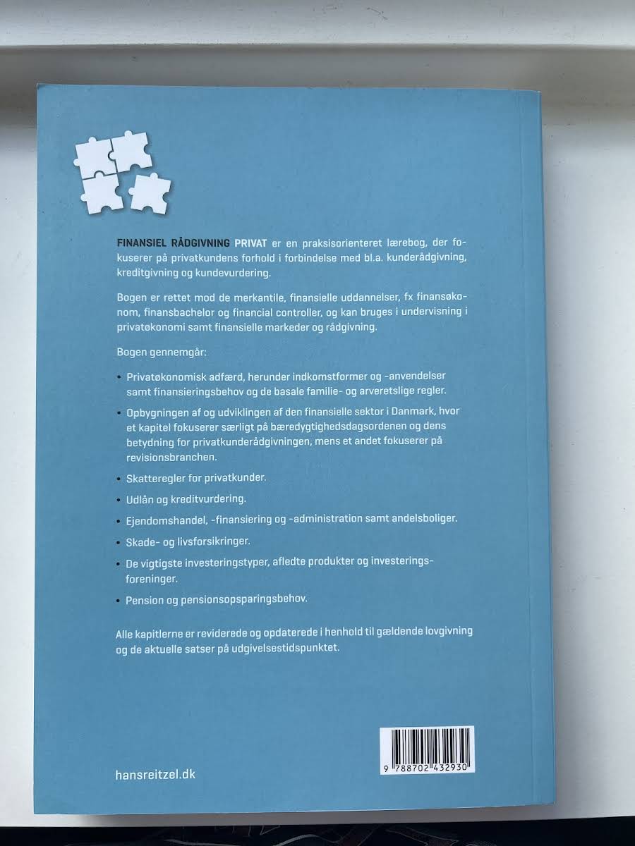 En opdateret og revideret 9. udgave af Finansiel rådgivning - privat fra Hans Reitzels Forlag (2025) er målrettet studerende på merkantile og finansielle uddannelser som finansøkonom, finansbachelor og financial controller. Den kan benyttes i undervisning inden for privatøkonomi, finansielle markeder og rådgivning. Udgaven på 520 sider sikrer, at du er helt ajour med de nyeste regler og praksis. Denne praksisorienterede lærebog fokuserer på privatkundens vilkår i kunderådgivning, kreditgivning og kundevurdering. Den kombinerer teori og praksis med eksempler, der illustrerer hverdagens udfordringer i finansiel rådgivning. Hvert kapitel er opbygget med henblik på at styrke dine faglige kompetencer. Bogen behandler emner som privatøkonomisk adfærd, indkomstformer og finansieringsbehov samt de basale familie- og arveretslige regler. Den gennemgår opbygningen og udviklingen af den finansielle sektor i Danmark med særligt fokus på bæredygtighedsdagsordenen og revisionsbranchen. Desuden er der afsnit om skatteregler for privatkunder, udlån og kreditvurdering, ejendomshandel, -finansiering, -administration og andelsboliger samt skade- og livsforsikringer. Afslutningsvis giver bogen dig indsigt i de vigtigste investeringstyper, afledte produkter, investeringsforeninger og pensionsopsparingsbehov. Alle kapitler er reviderede og opdaterede i henhold til gældende lovgivning og aktuelle satser pr. 2025.