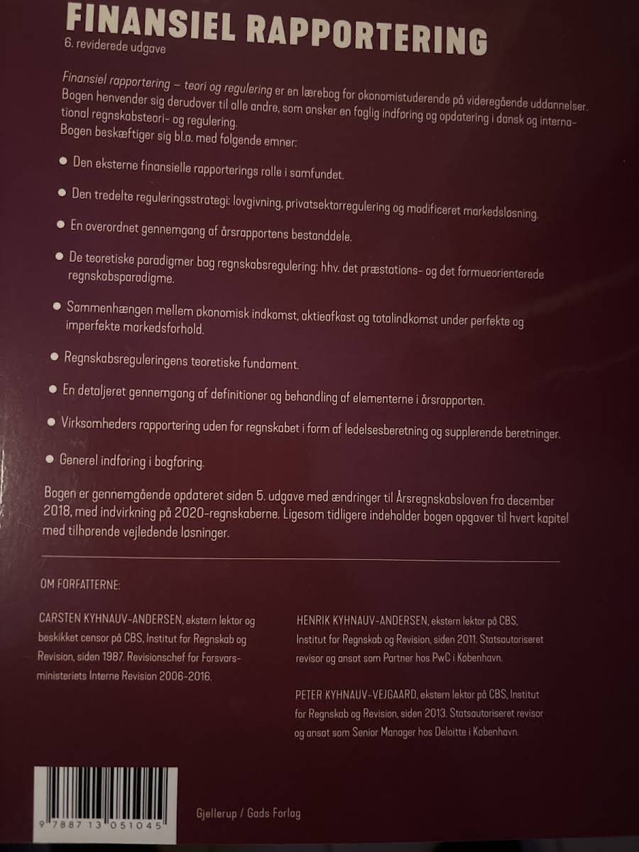Finansiel rapportering - teori og regulering er en grundlæggende lærebog målrettet økonomistuderende på universiteter og erhvervsøkonomiske videregående uddannelser. Den henvender sig samtidig til praktikere og alle, der ønsker en opdateret indføring i såvel dansk som international regnskabsteori og -regulering. Bogens hovedtemaer omfatter blandt andet: • Den eksterne finansielle rapporterings rolle og betydning for samfundet • Reguleringens tre søjler: lovgivning, privatsektorregeler og markedsløsninger • Gennemgang af årsrapportens enkelte komponenter • Regnskabsteoriens paradigmer: performance- versus formueorienteret tilgang • Sammenhængen mellem økonomisk indkomst, aktieafkast og totalindkomst under forskellige markedsforhold • Rapportering ud over tallene - ledelsesberetning og supplerende oplysninger I 6. udgave er bogen ajourført med ændringerne i Årsregnskabsloven fra december 2018, som har betydning for 2020-regnskaberne. Et helt nyskrevet kapitel om bogføring supplerer den teoretiske gennemgang, og hvert af bogens kapitler afsluttes med opgaver og vejledende løsningsforslag samt yderligere undervisningsmateriale. Forfatterteamet består af Jens O. Elling samt Carsten, Henrik og Peter Kyhnauv-Andersen, der tilsammen bringer omfattende akademisk indsigt og praktisk erfaring inden for regnskab, revision og undervisning.