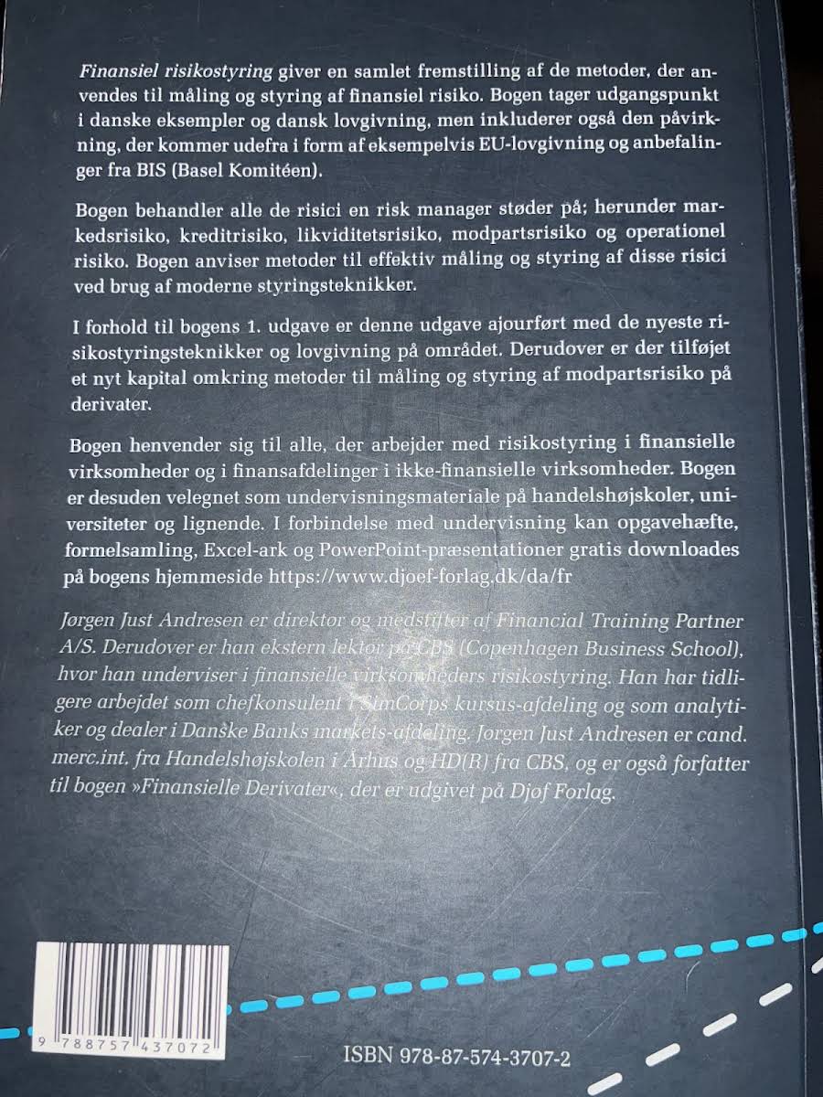 "Finansiel Risikostyring" giver et indsigtsfuldt overblik over de metoder, der anvendes til at identificere, måle og styre finansielle risici. Bogen trækker på danske eksempler og lovgivning og inddrager samtidig påvirkninger fra EU-reguleringer og BIS’ anbefalinger, hvilket sikrer en helhedsorienteret tilgang til emnet. Med fokus på de centrale risikoområder – herunder markeds-, kredit-, likviditets-, modparts- og operationel risiko – præsenteres moderne metoder til effektiv risikostyring. Denne udgave er opdateret med de nyeste teknikker og lovmæssige krav og indeholder desuden et nyt afsnit om måling og styring af modpartsrisiko på derivater. Bogen henvender sig til fagfolk, der arbejder med finansiel risikostyring i både finansielle virksomheder og i finansafdelinger i andre virksomheder, samt til undervisningen på handelshøjskoler og universiteter.